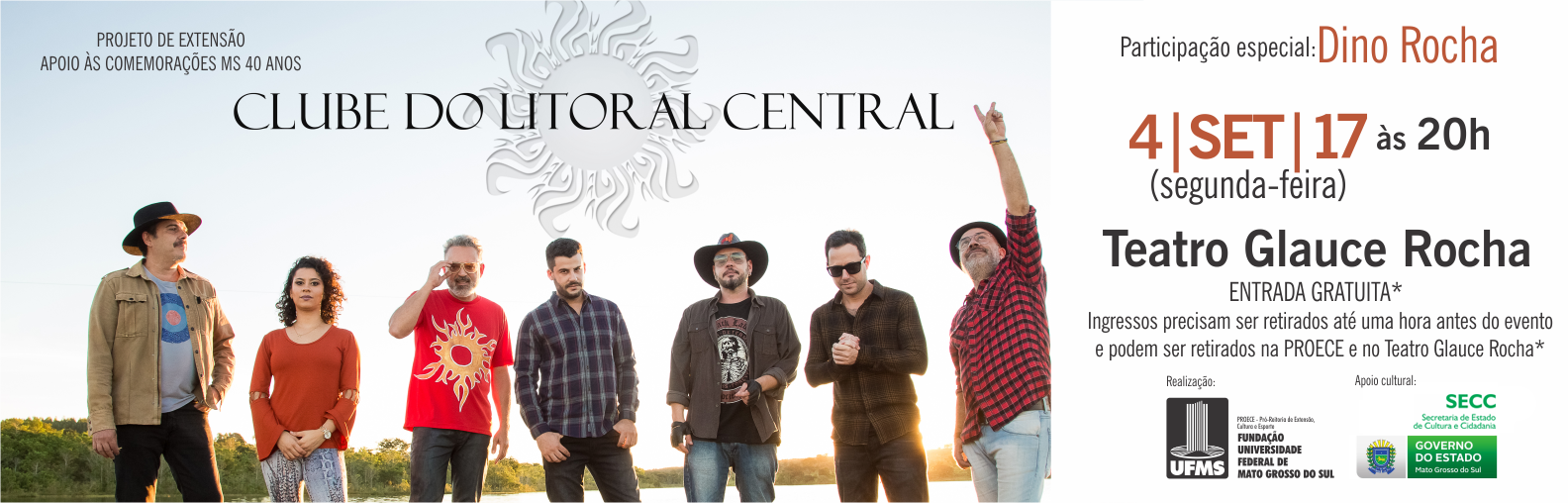 Na próxima segunda-feira (4) a partir das 20h o grupo Clube do Litoral Central fará uma apresentação musical no Teatro Glauce Rocha. O evento é gratuito e faz parte do Projeto de Extensão “Apoio às Comemorações MS 40 anos”.