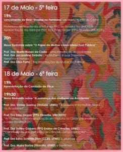 A programação também contará com o lançamento do livro “Ensaios no Feminino”, da professora de filosofia da UFMS, Marta Nunes da Costa. Na obra são expostos cinco ensaios, os quais abordam a necessidade de compreensão do lugar das mulheres, não só na disciplina de Filosofia como dentro de uma sociedade democrática.