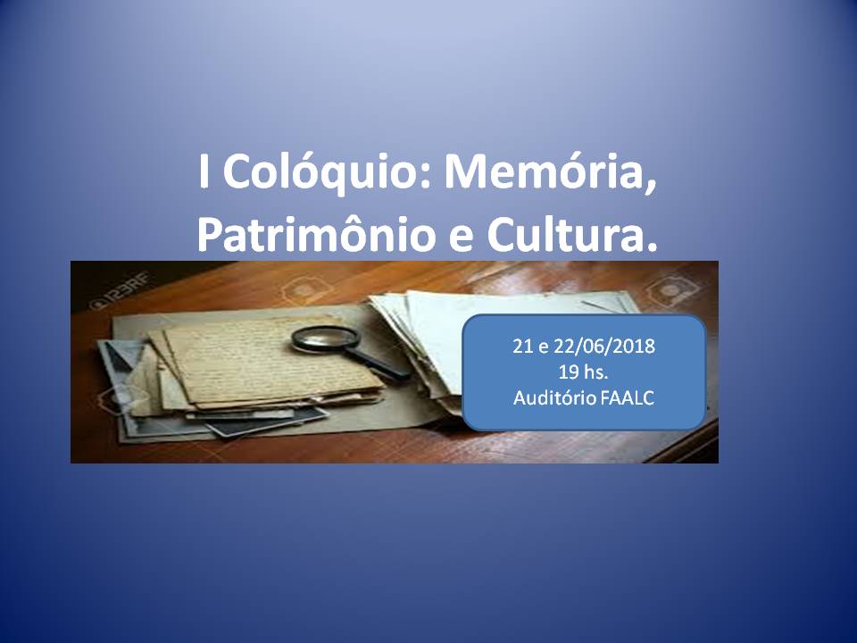 A primeira edição do Colóquio: Memória, Patrimônio e Cultura será realizada entre os dias 21 e 22 deste mês, no anfiteatro do corredor central da Cidade Universitária. O evento é um projeto do Grupo de Pesquisa: “Ensino de História, Mulheres e Patrimônio” do curso da FAALC.
