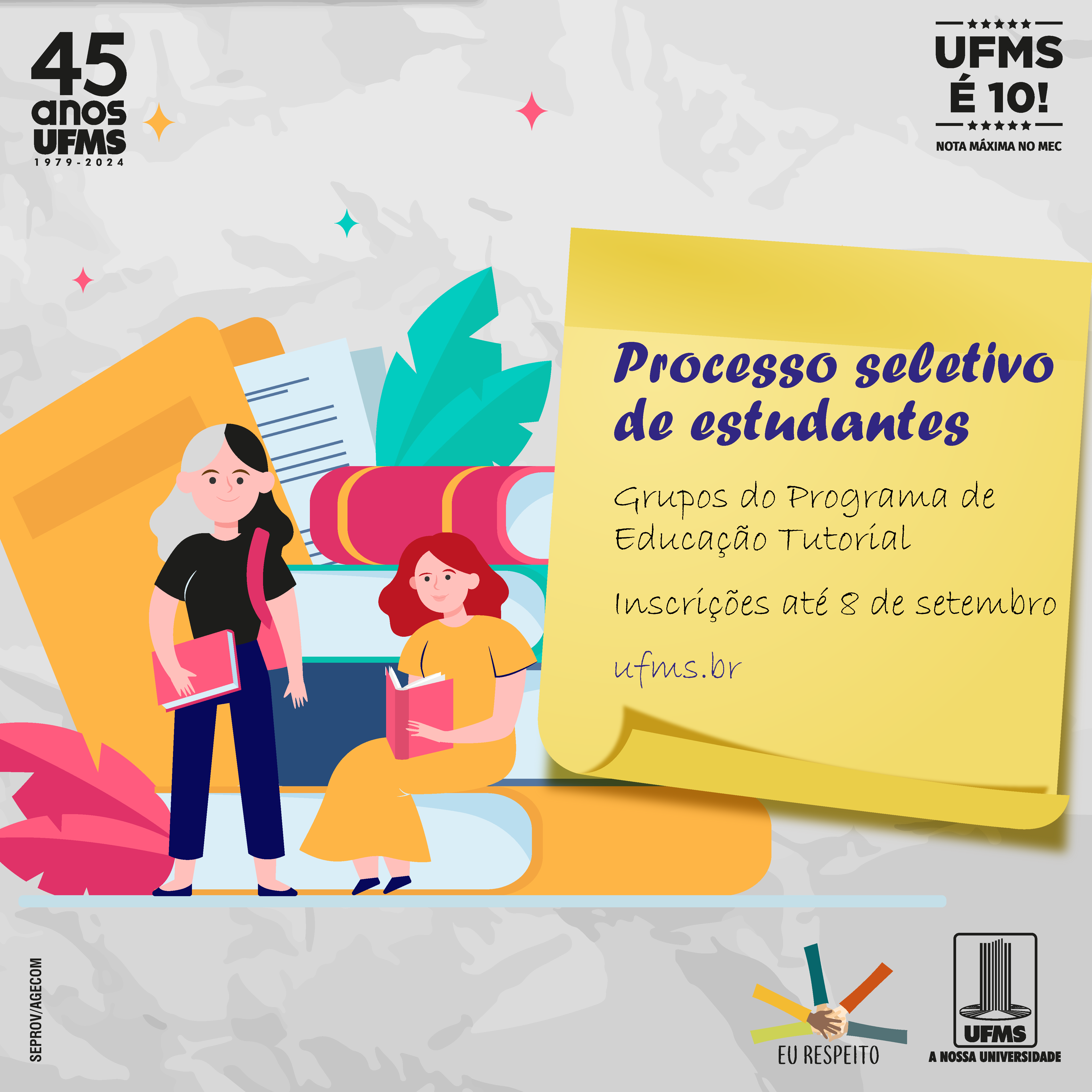 O Programa de Educação Tutorial (PET) está com inscrições abertas para estudantes de graduação da UFMS atuarem como bolsistas e voluntários. São 53 vagas distribuídas entre seis unidades da Cidade Universitária e para os Câmpus de Naviraí (CPNV), Ponta Porã (CPPP) e de Três Lagoas (CPTL). Os interessados devem realizar a inscrição por meio do Sistema de Informação e Gestão de Projetos até 8 de setembro.