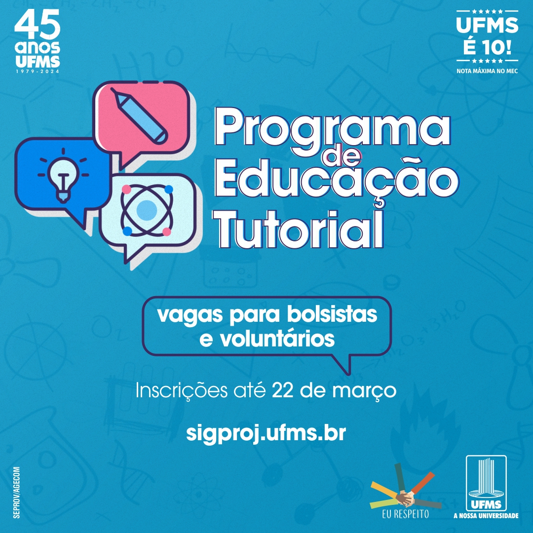 O Programa de Educação Tutorial abriu inscrições para estudantes de graduação atuarem como bolsistas e voluntários. As vagas são para a Cidade Universitária e para os Câmpus do Pantanal (Cpan), de Chapadão do Sul (CPCS), de Naviraí (CPNV), de Ponta Porã (CPPP) e de Três Lagoas (CPTL). As inscrições podem ser realizadas no Sistema de Informação e Gestão de Projetos até sexta-feira, 22.