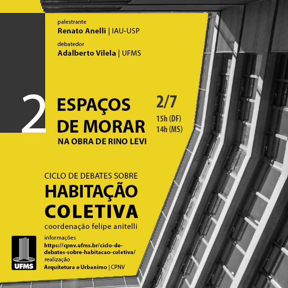 Na próxima sexta-feira, 2 de julho, a partir das 14h no horário de Mato Grosso do Sul, será realizado o segundo evento virtual do Ciclo de debates sobre habitação coletiva. Renato Anelli do Instituto de Arquitetura e Urbanismo da Universidade de São Paulo (IAU-USP) irá falar sobre “Espaços de morar na obra de Rino Levi”. O debatedor será Adalberto Vilela da UFMS. A inscrição pode ser feita neste link.