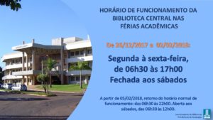 26 de dezembro a 2 de fevereiro de 2018, a Biblioteca Central terá horário especial de funcionamento.