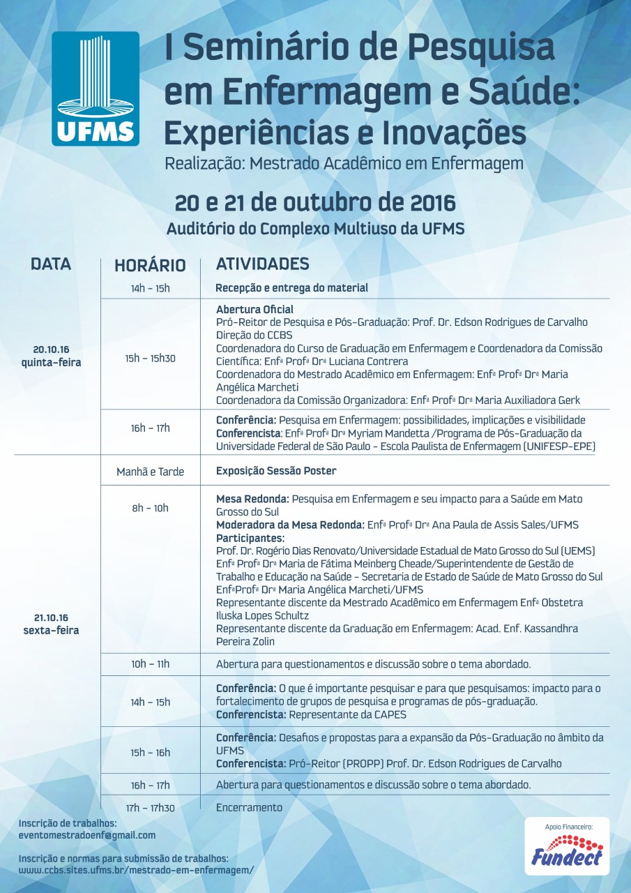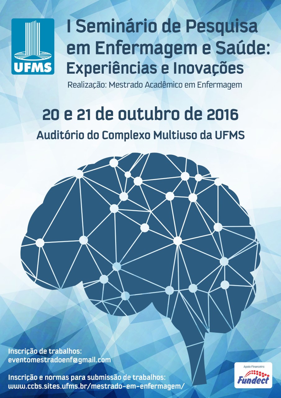 cartazO Mestrado em Enfermagem da Universidade Federal de Mato Grosso do Sul realiza nossa dias 20 2 21 de outubro o I Seminário de Pesquisa em Enfermagem e Saúde: experiências e inovações.