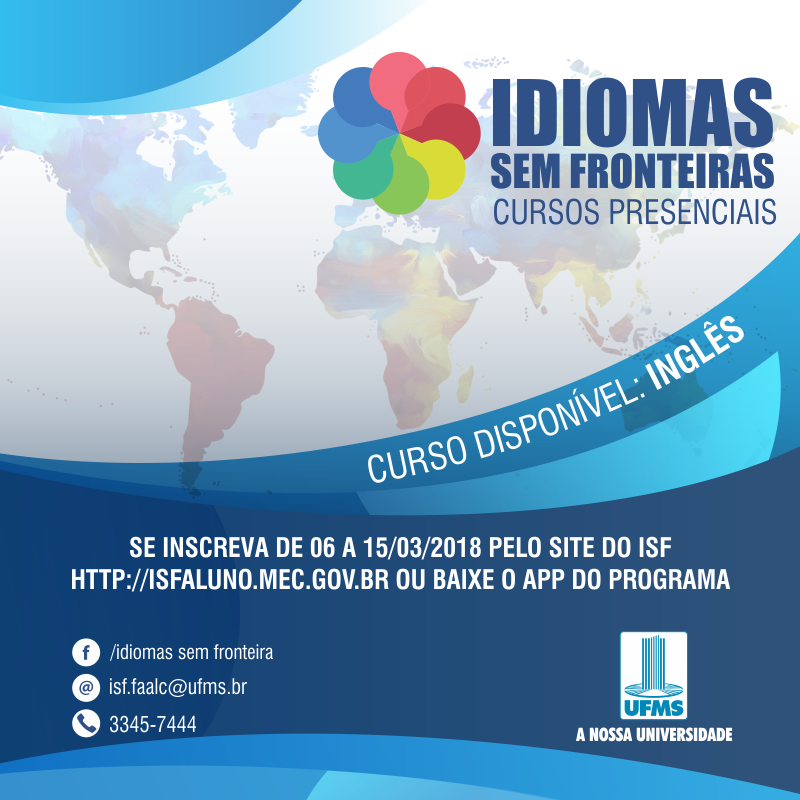 O Idiomas Sem Fronteiras oferta novamente vagas de Inglês. As inscrições podem ser feitas até 15/03 pelo site do ISF – http://isfaluno.mec.gov.br ou pelo aplicativo do programa.