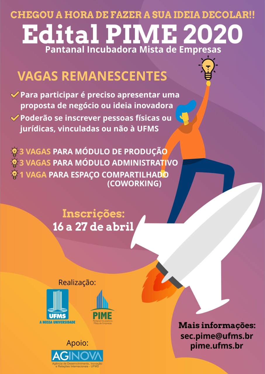 Estão abertas, até 27 de abril, as inscrições para incubação na Pantanal Incubadora Mista de Empresas (Pime) da UFMS. São sete oportunidades para toda a comunidade e as orientações para o envio de propostas estão detalhadas no site da Pime.