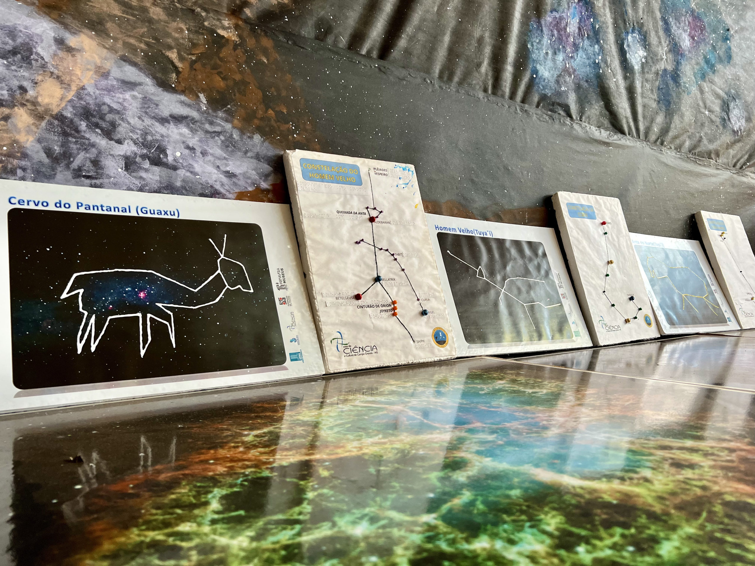 Para facilitar as visualizações das constelações, a equipe do projeto elaborou painéis texturizados. Além da experiência visual, o relevo permite a sensação tátil e a interação de pessoas com deficiência ou limitação visual.