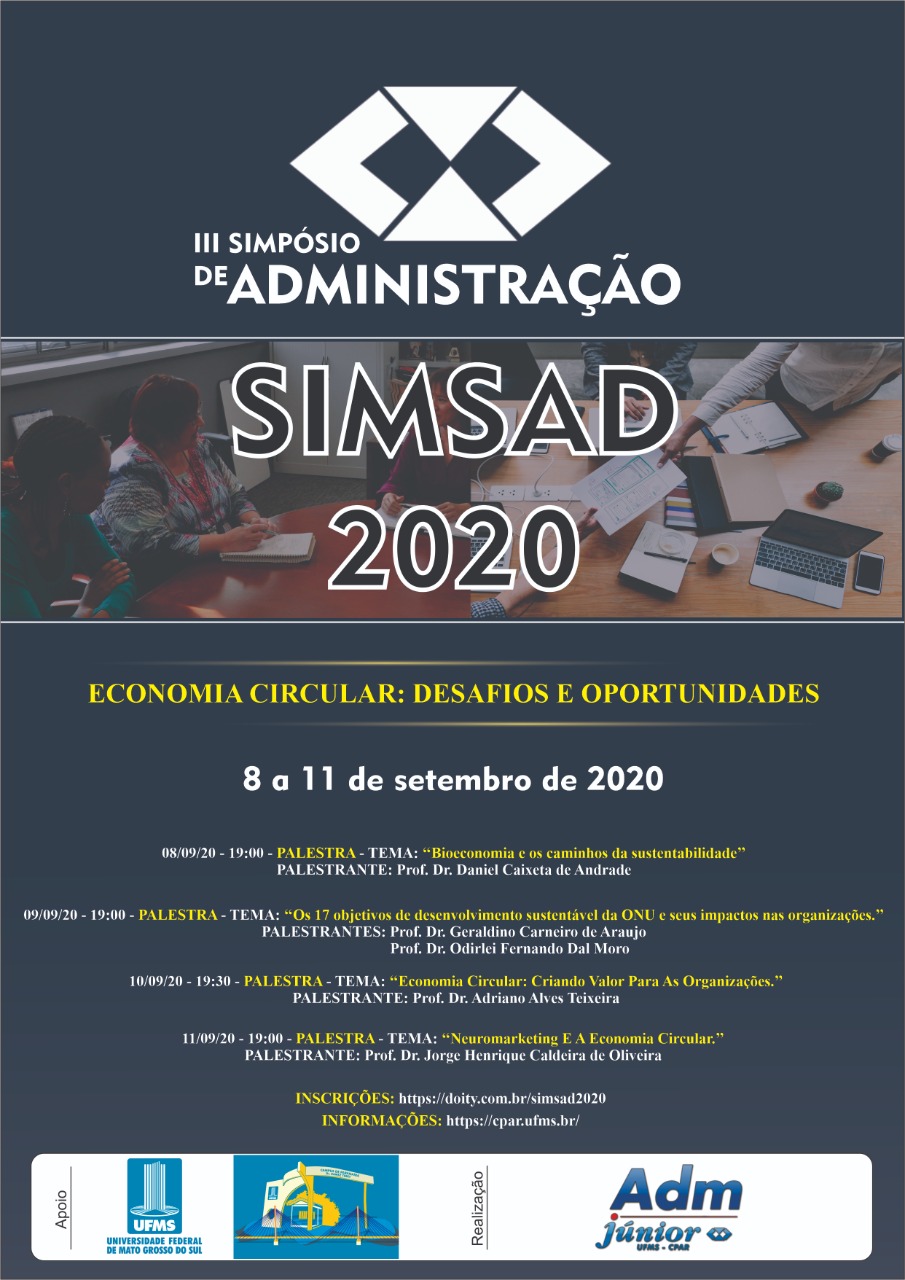 Dos dias 8 a 11 de setembro será realizado o 3º Simpósio Sul-Mato-Grossense de Administração (SIMSAD), evento acadêmico-científico realizado pela Empresa Júnior do curso de Administração do Campus de Paranaíba.