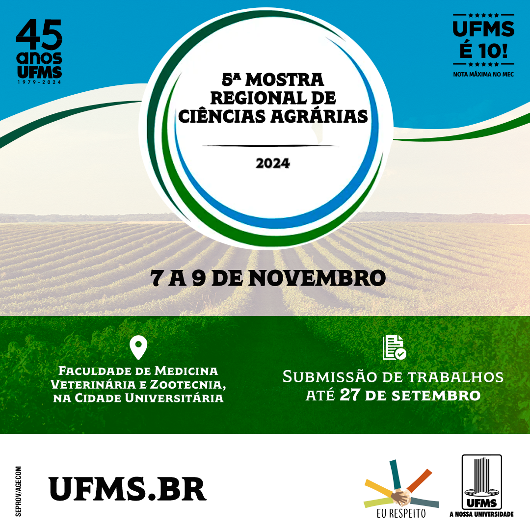 Estão abertas as inscrições de trabalhos para a 5ª Mostra Regional de Ciências Agrárias, que será realizada de 7 a 9 de novembro na Faculdade de Medicina Veterinária e Zootecnia (Famez), na Cidade Universitária. Podem ser inscritos projetos nas modalidades pesquisa, ensino, extensão e relato de caso. Os interessados devem enviar os resumos até 27 de setembro na página do evento.