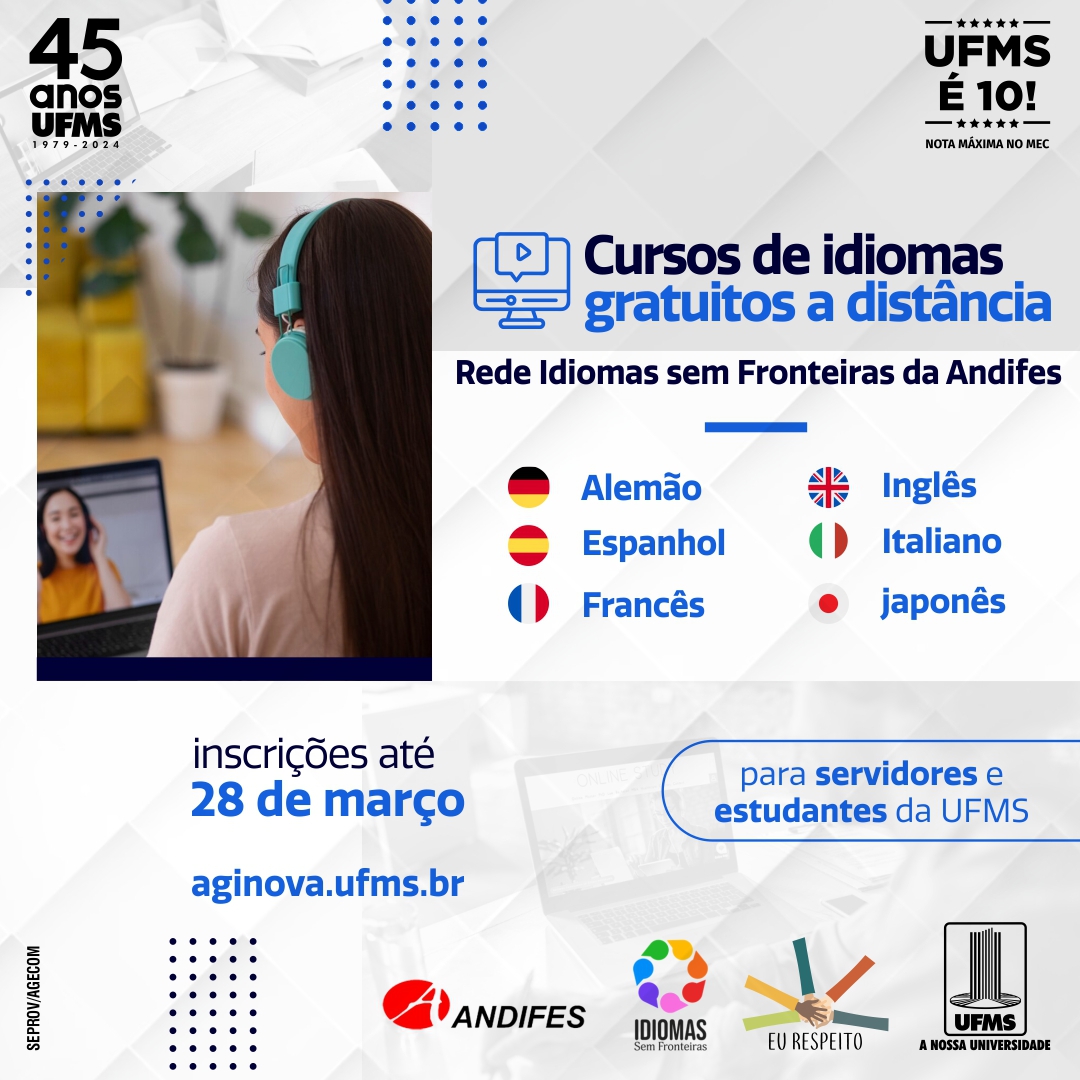 A Rede Idioma sem Fronteiras (Rede IsF), da Associação Nacional dos Dirigentes das Instituições Federais de Ensino Superior (Andifes), está com as inscrições abertas para cursos gratuitos em seis idiomas até o dia 28 de março. A oferta coletiva é destinada aos estudantes de graduação e pós-graduação, docentes e técnicos-administrativos da Universidade e para a todas as comunidades das instituições vinculadas à Rede IsF.