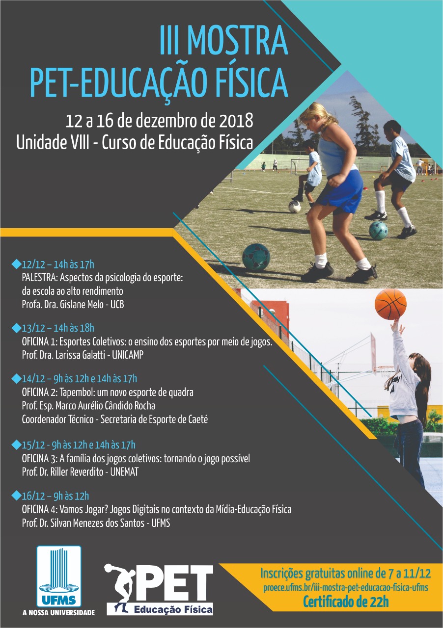 Estão abertas as inscrições para a 3ª mostra Programa de Educação Tutorial (PET) promovida pelo curso de Educação Física da UFMS. As atividades serão realizadas entre os dias 12 e 16 de dezembro na Cidade Universitária.