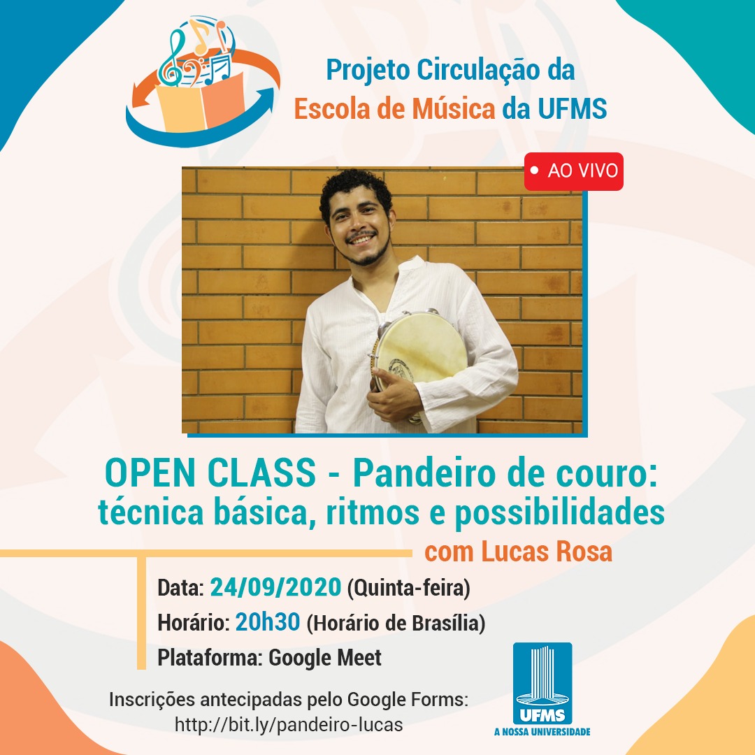 Na quinta-feira, 24, o  Projeto Circulação da Escola de Música da UFMS promove mais uma Open class o tema desta vez será: Pandeiro de couro: técnicas básicas, ritmos e possibilidades. A aula, on-line, será ministrada pelo egresso do curso de Música, Lucas Rosa, que também é percussionista da Orquestra Sinfônica de Campo Grande.