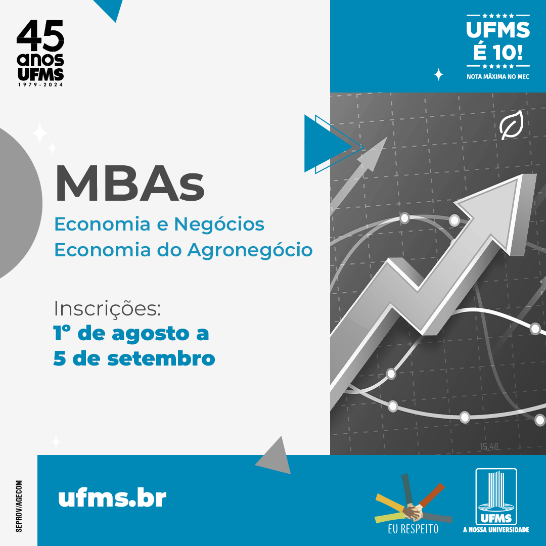 Estão abertas as inscrições para os processos seletivos para ingresso nos programas de MBA em Economia do Agronegócio e MBA em Economia e Negócios. Ambos são oferecidos pela Escola de Administração e Negócios (Esan) da UFMS. Os interessados devem se inscrever até 5 de setembro.