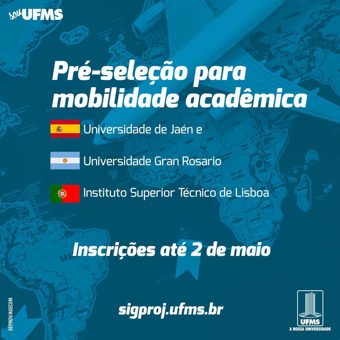 Estudantes regularmente matriculados em cursos de graduação ou de pós-graduação da Universidade podem cadastrar para mobilidade acadêmica internacional na Universidade de Jaén, na Espanha, na Universidade Gran Rosario, na Argentina, e no Instituto Superior Técnico de Lisboa, em Portugal. As inscrições para pré-seleção devem ser feitas por meio de preenchimento de formulário no SigProj.