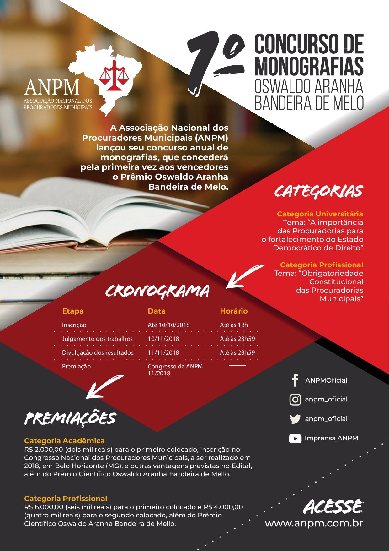 Até o dia 10 deste mês, estão abertas as inscrições para o 1º Concurso de Monografias, promovido pela Associação Nacional dos Procuradores Municipais (ANPM). O evento irá selecionar trabalhos nas categorias universitária e profissional. Para trabalhos acadêmicos, o tema proposto é “a importância das Procuradorias para o fortalecimento do estado democrático de direito”, já os trabalhos profissionais deverão abordar a “obrigatoriedade constitucional das Procuradorias Municipais”.