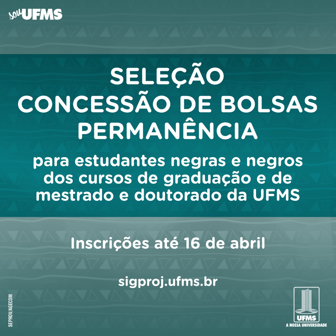Estudantes negras e negros têm novo prazo para se inscrever em bolsas permanência, até 16 de abril. O benefício será destinado a estudantes regularmente matriculados em cursos de graduação e pós-graduação na Cidade Universitária e nos Câmpus do Pantanal, Três Lagoas e de Aquidauana. São 19 vagas, sendo 11 para graduação, e oito distribuídas entre cursos de mestrado e doutorado, escolhidas pelo Carrefour Comércio e Indústria, em função do processo nº 23104.005154/2023-30. O público-alvo da ação são estudantes negras e negros, em áreas de conhecimento que, historicamente, tenham baixa representatividade da população negra.