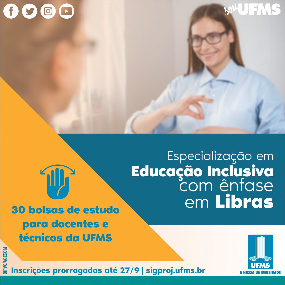 Foi ampliado para até 27 de setembro o prazo para docentes e técnicos administrativos se inscreverem para bolsas de estudo na especialização em Educação Inclusiva com ênfase em Libras. Os interessados podem acessar o edital de seleção neste link e realizar a inscrição no Sigproj.