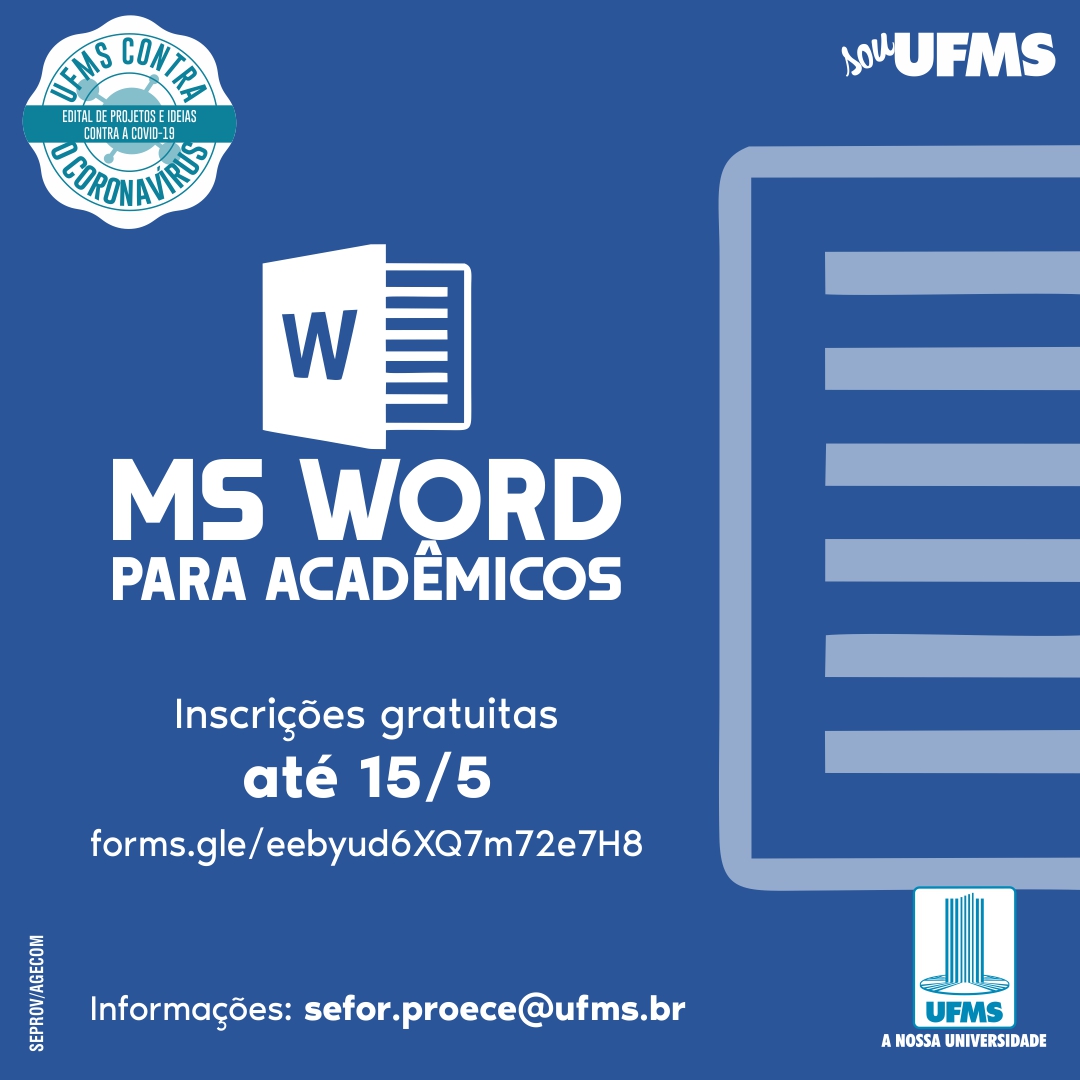 O curso “MS Word para acadêmicos” está na quarta edição e tem como objetivo o ensino de técnicas de formatação para o desenvolvimento de documentos acadêmicos, seguindo os critérios da Associação Brasileira de Normas Técnicas (ABNT). As inscrições são gratuitas e poderão ser feitas a partir desta segunda-feira, 26, neste link.