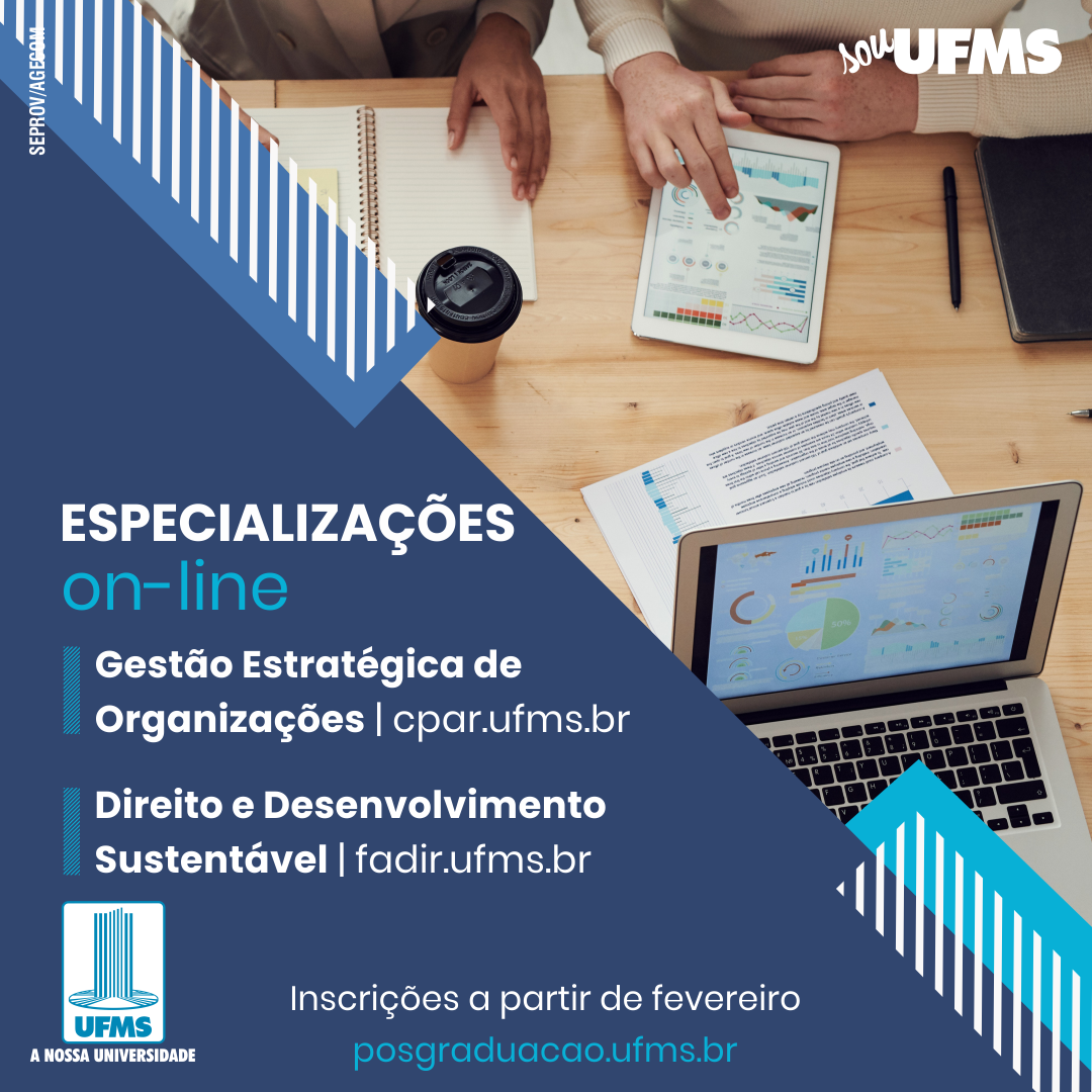 Em fevereiro, começam as inscrições para dois cursos de Pós-graduação Lato Sensu nas áreas da Administração e do Direito, oferecidos na Cidade Universitária e no Câmpus de Paranaíba (Cpar). As aulas serão realizadas de forma remota, com atividades ao vivo e assíncronas.