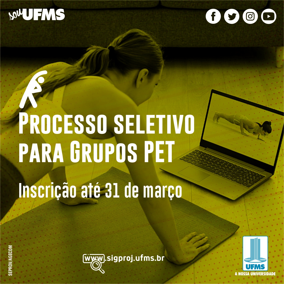 Nos grupos PET, os acadêmicos, sob tutoria de um professor, realizam atividades orientados pelo princípio da indissociabilidade entre ensino, pesquisa, extensão e educação tutorial. Há vagas para grupos PET nos câmpus de Naviraí, Chapadão do Sul, Pantanal, Três Lagoas e Ponta Porã. Na Cidade Universitária há vagas para os grupos PET ligados aos institutos de Física e Química e as faculdades de Computação e Medicina Veterinária e Zootecnia. O valor mensal de cada uma das 47 bolsas é de R$ 400,00, custeadas com recursos do Ministério da Educação e pagas diretamente pelo Fundo Nacional de Desenvolvimento da Educação.