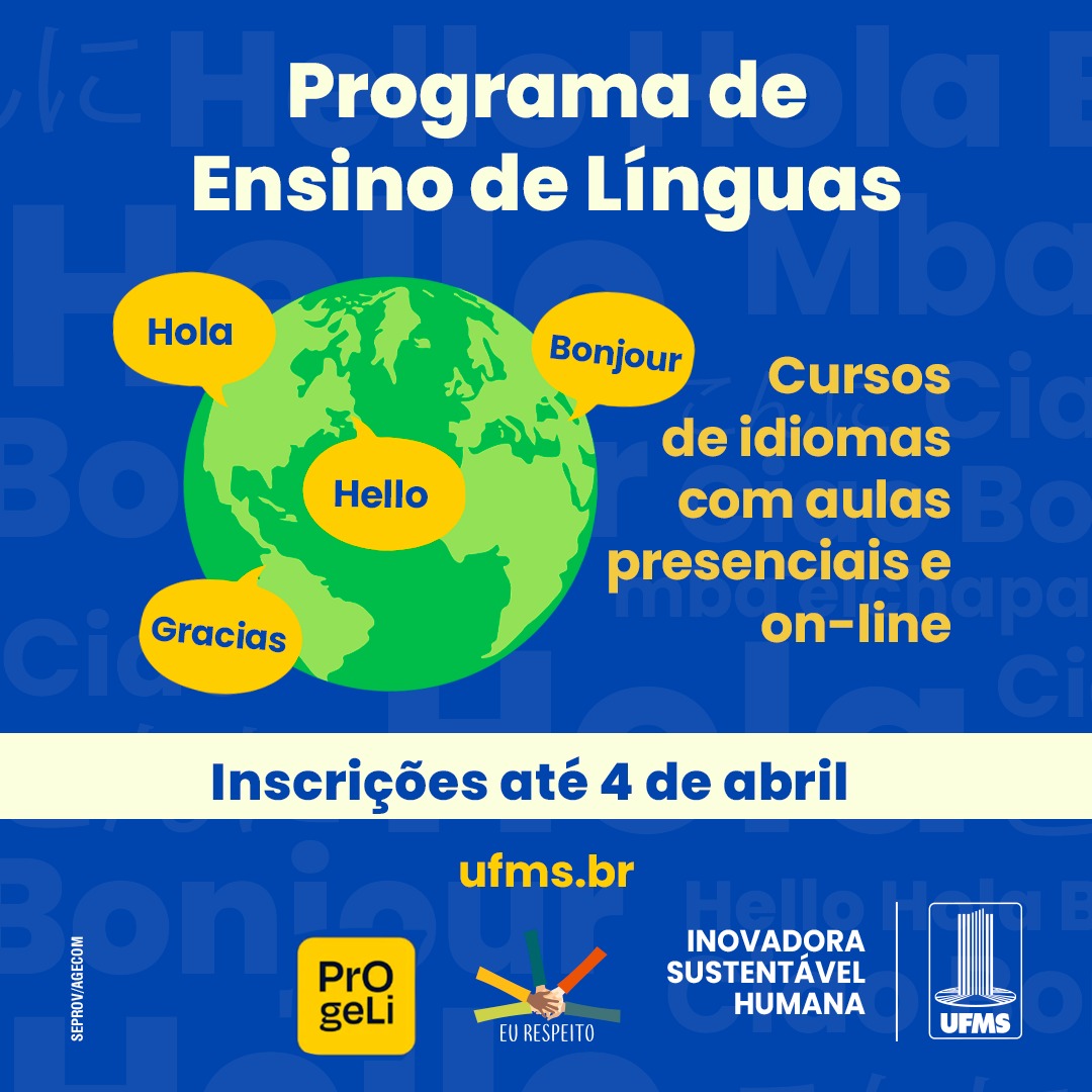 Estão abertas as inscrições para os cursos de línguas oferecidos pela Universidade, por meio do Programa de Ensino de Línguas (Progeli) da Escola de Línguas: Centro Multilíngue e Multicultural da UFMS. Há turmas presenciais e on-line, em diversos níveis, para idiomas como alemão, espanhol, francês, guarani, inglês, italiano, japonês e português para estrangeiros.