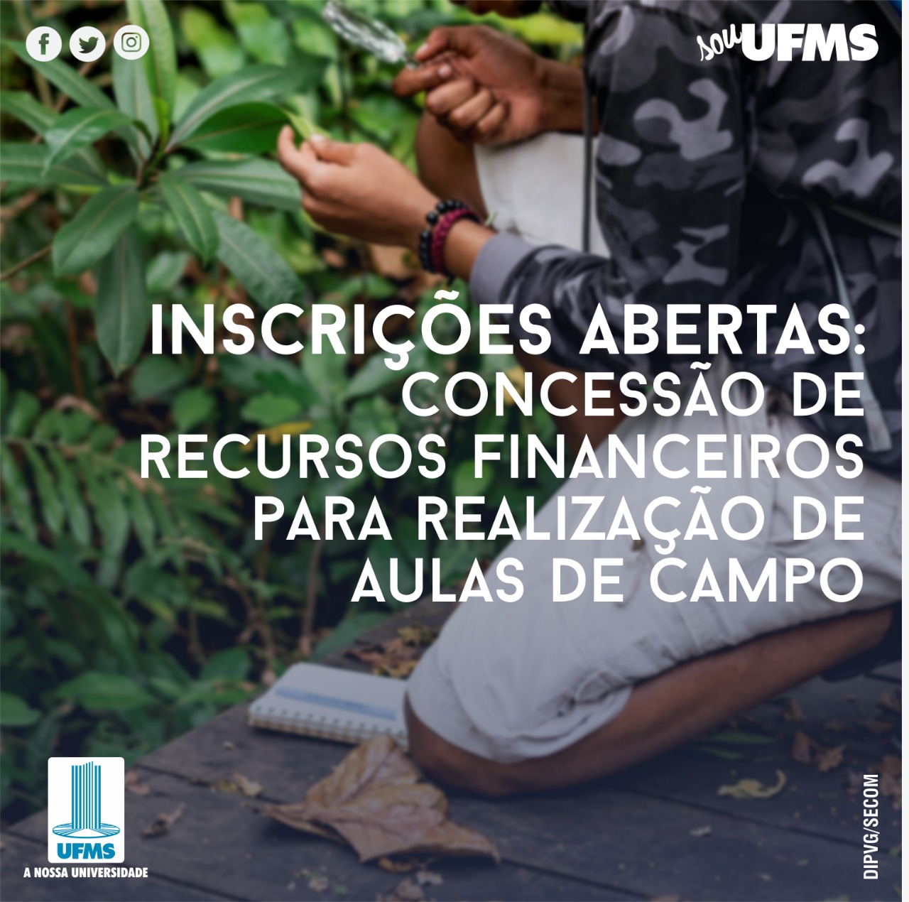 A UFMS recebe até o dia 17 de março inscrições para a concessão de recursos financeiros para a realização de aulas de campo dos cursos de graduação presenciais. São consideradas aulas de campo as atividades didático/pedagógicas de natureza prática, das disciplinas obrigatórias ou optativas, que exigem o deslocamento para estudos fora da sede do curso.