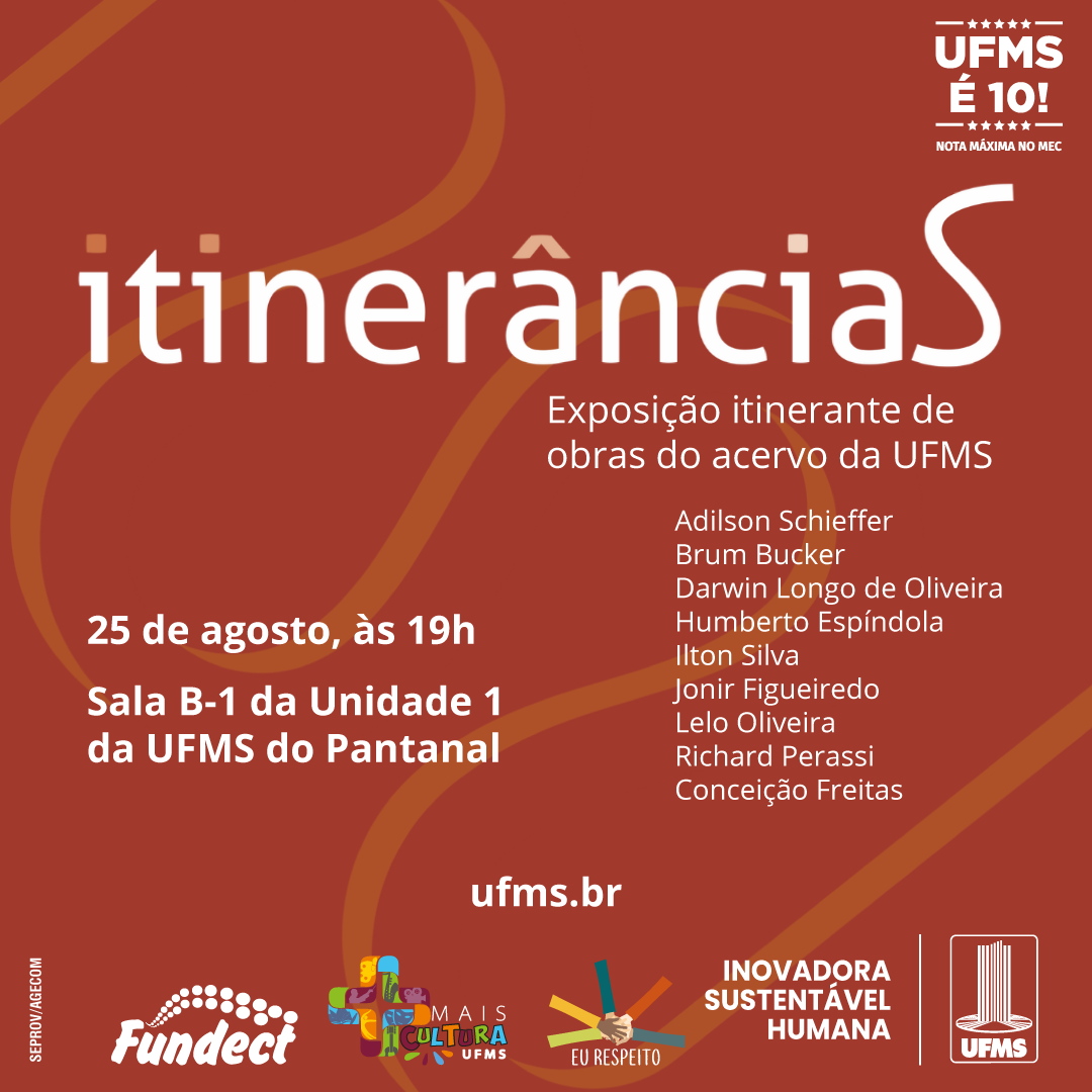 Até 3 de setembro, a comunidade de Corumbá e Ladário poderá visitar, de forma gratuita, a exposição Itinerâncias, que chega ao Câmpus da UFMS do Pantanal (CPan) já na próxima segunda-feira, 25. A abertura está marcada para às 19h, na sala B-1 da Unidade 1 do CPan, e contará com a participação da cantora corumbaense Ivi Rondon para uma apresentação musical em homenagem à viola de cocho.