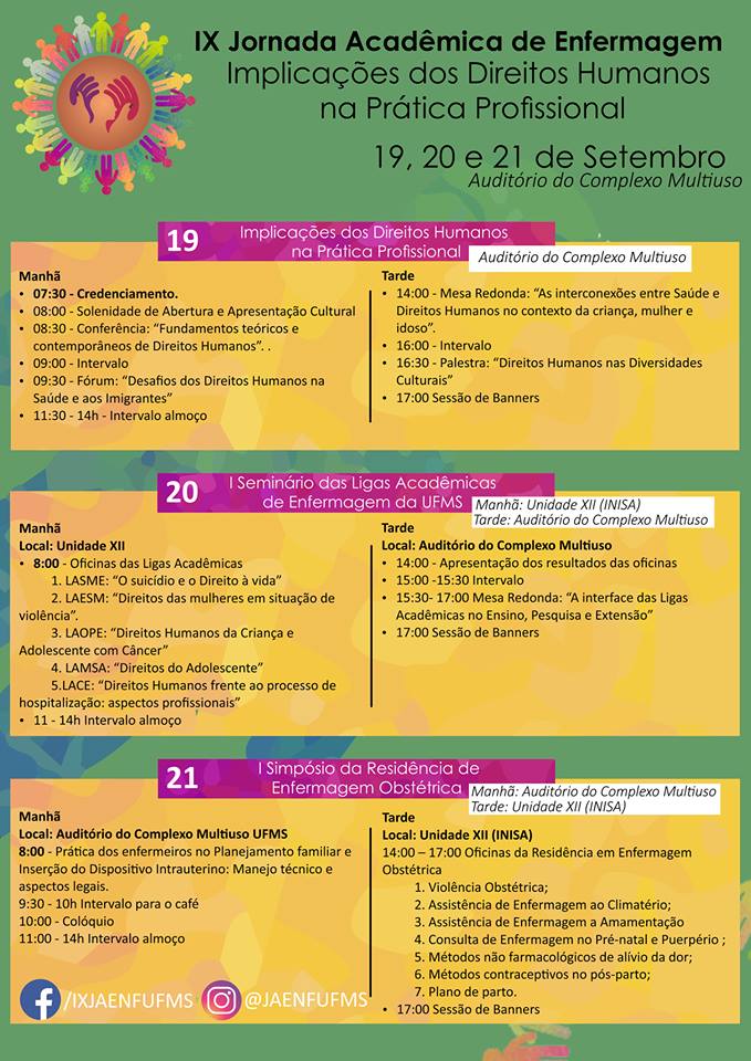 Nos dias 19, 20 e 21 de setembro será realizada a 9ª Jornada Acadêmica de Enfermagem, na Cidade Universitária, que vai debater as implicações dos Direitos Humanos na prática profissional em Enfermagem. Serão realizados também o 1º Simpósio da Residência de Enfermagem Obstétrica e o 1º Seminário das Ligas Acadêmicas de Enfermagem da UFMS. As inscrições seguem abertas até quarta-feira (19) e são gratuitas.