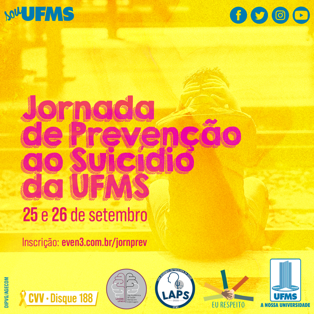 Como parte da campanha Eu respeito, que foi retomada sob o tema de valorização da vida, será realizada em 25 e 26 de setembro a Jornada de Prevenção ao Suicídio da UFMS. O evento será on-line e gratuito, aberto à participação de toda a comunidade. As inscrições podem ser feitas neste link.