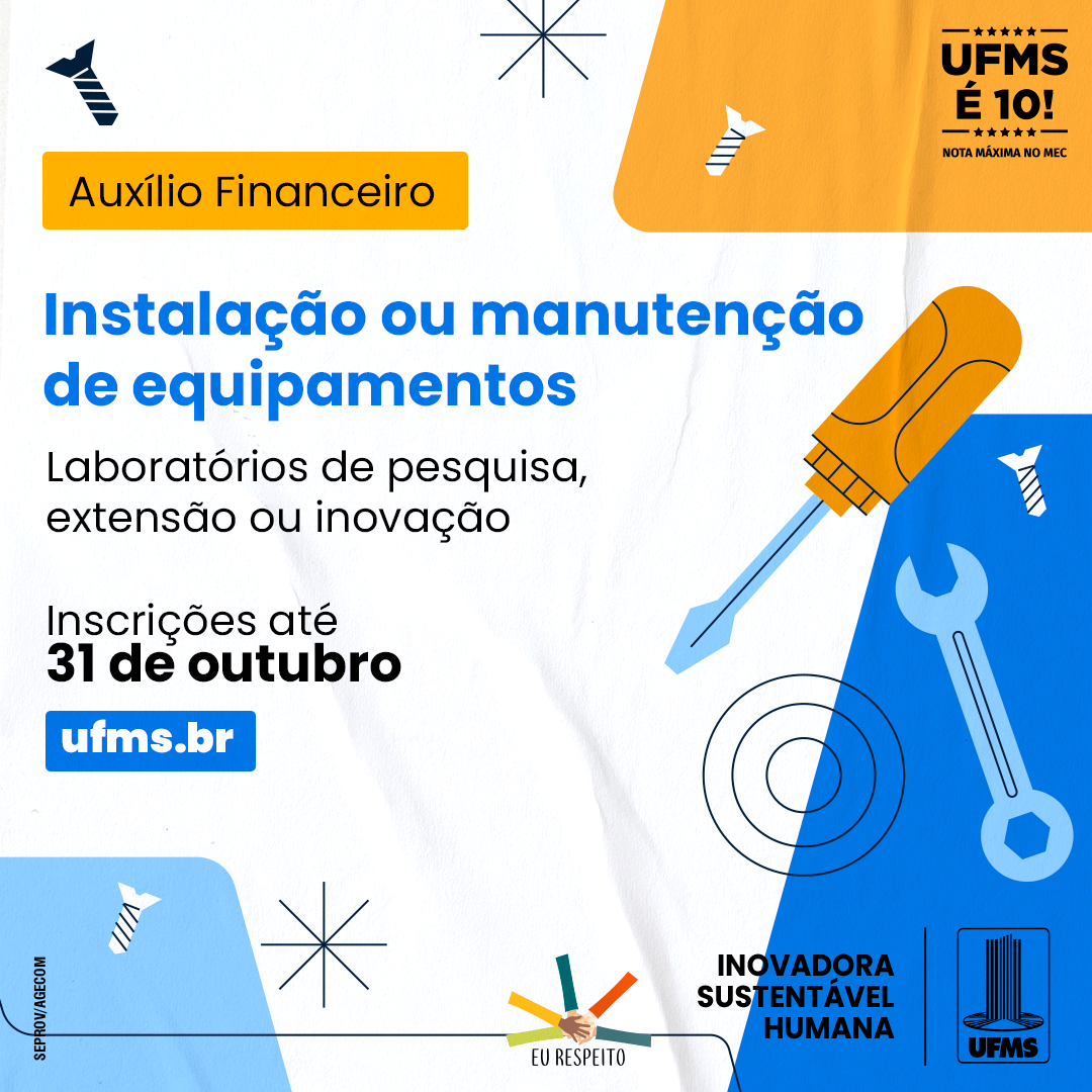 Os pesquisadores da Universidade podem solicitar auxílio financeiro para instalação e manutenção de equipamentos utilizados em laboratórios de pesquisa, extensão ou inovação da UFMS. As propostas devem ser enviadas no Sistema de Informação e Gestão de Projetos (Sigproj) até 31 de outubro.