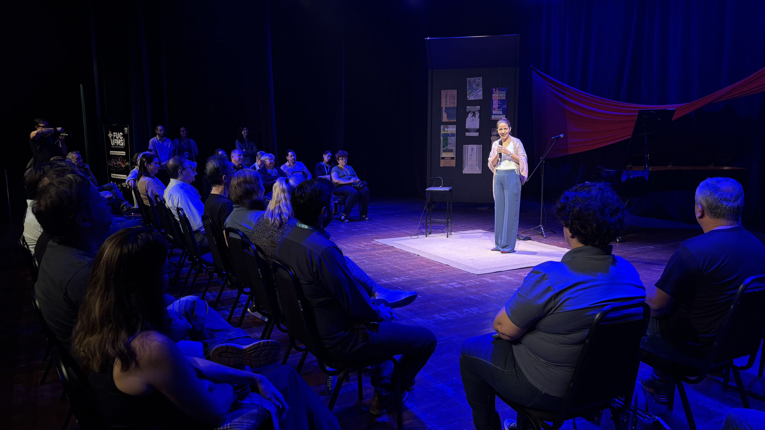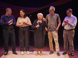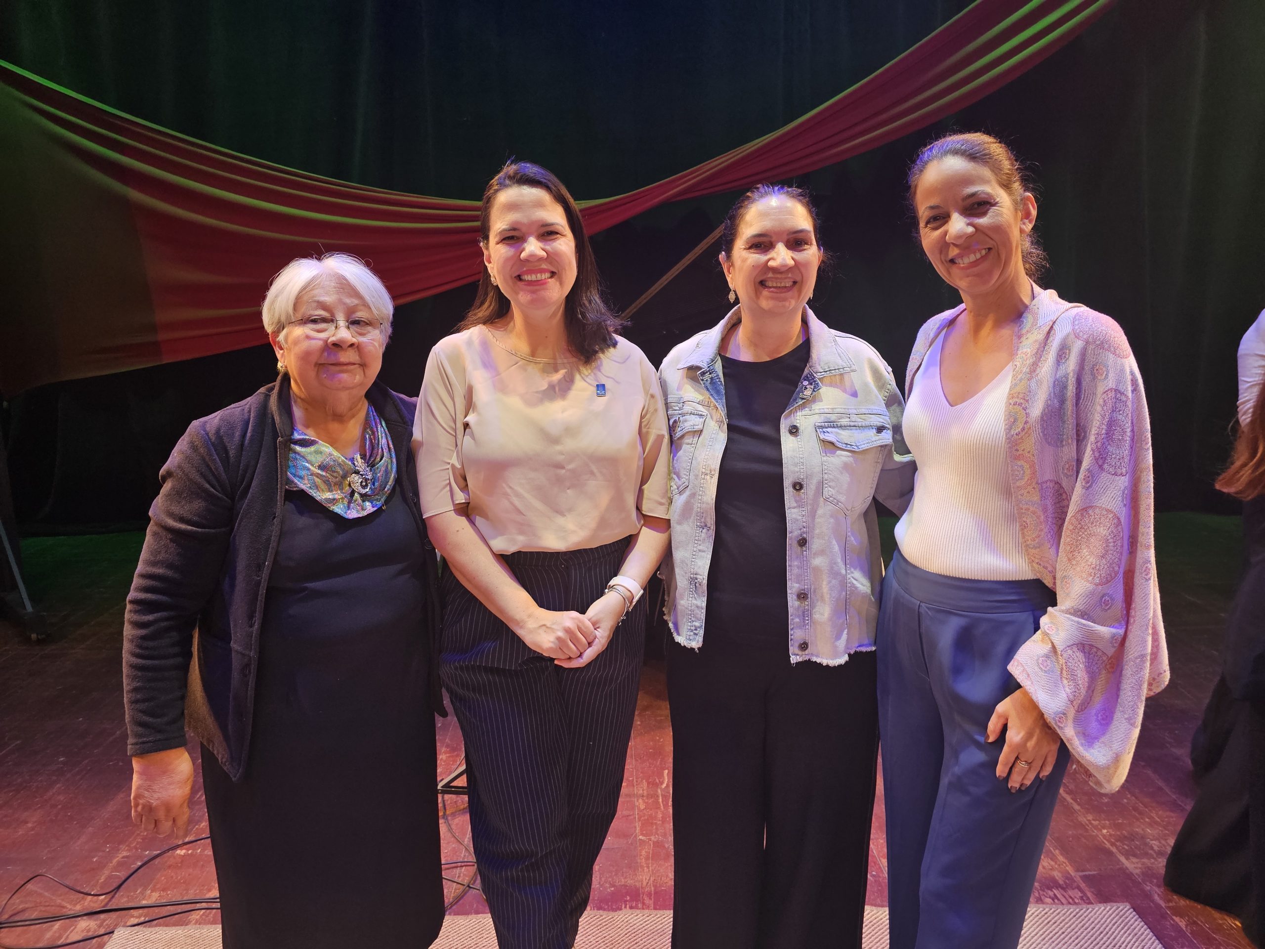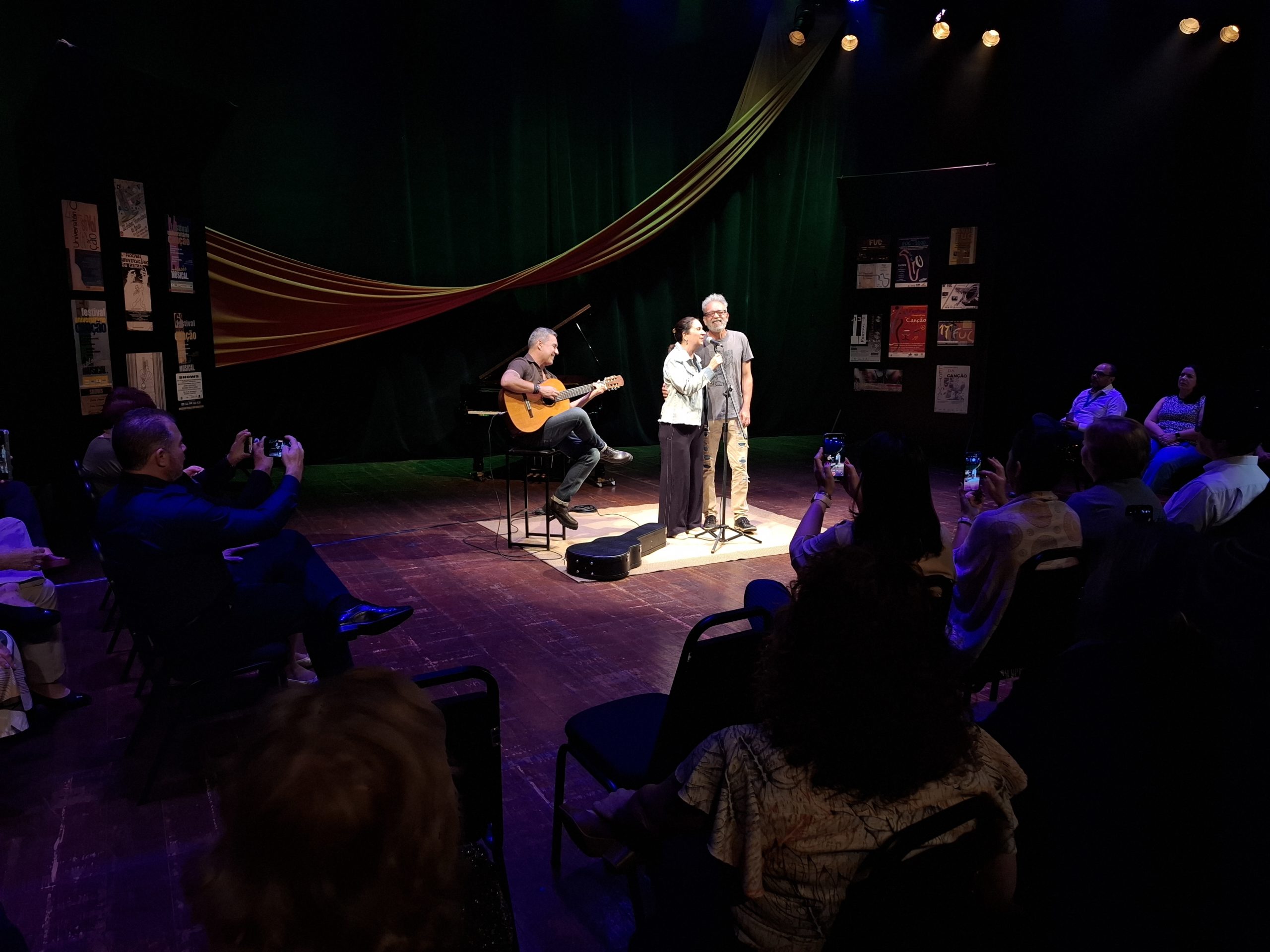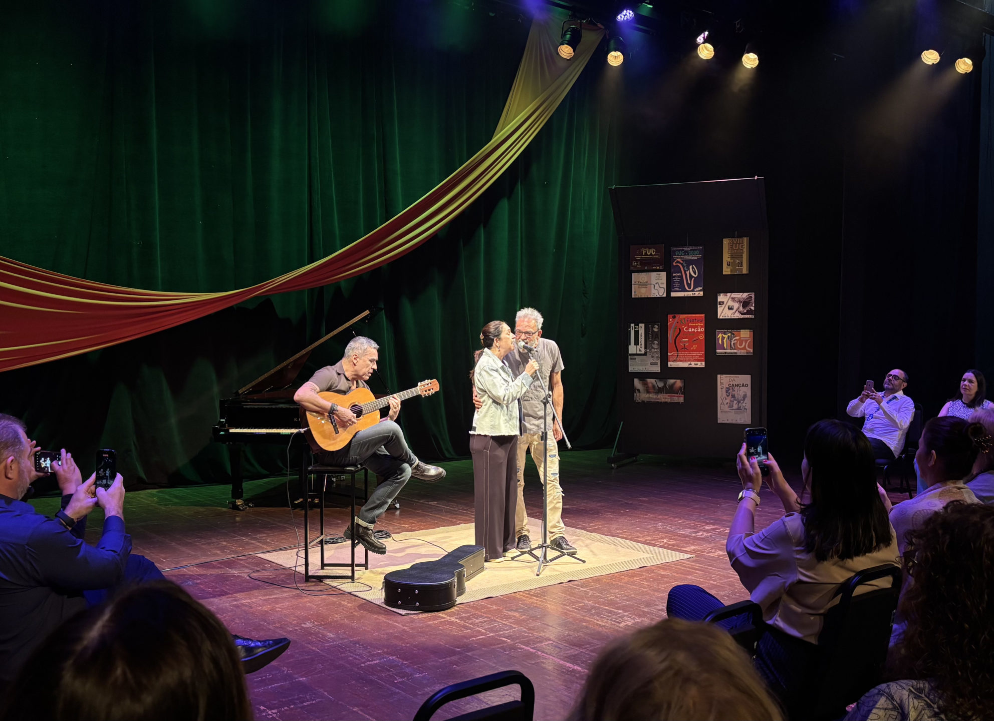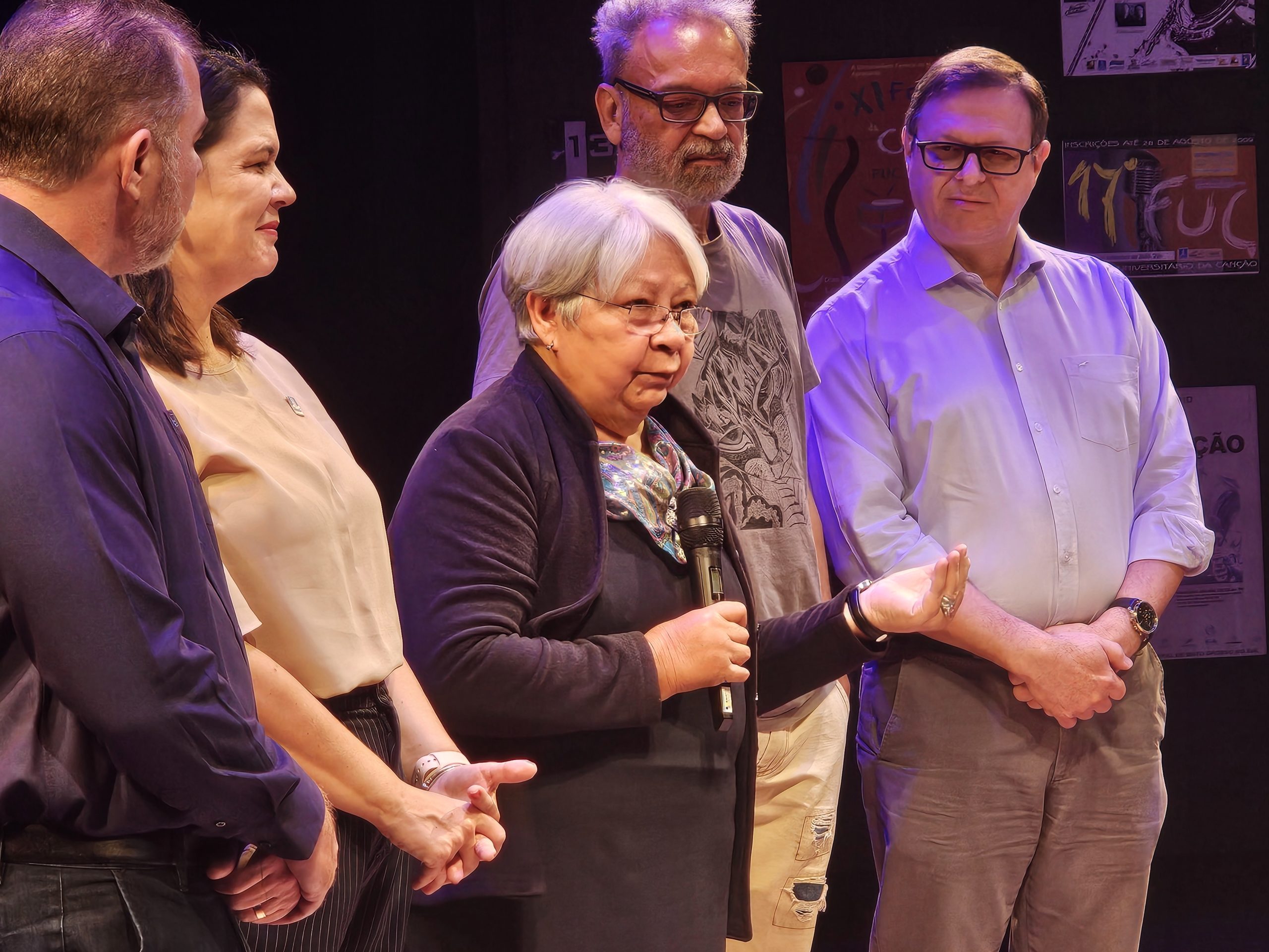 A diretora de Cultura, Arte e Popularização da Ciência da Proece, Rozana Valentim, falou sobre o motivo do convite a todos os participantes da cerimônia a estarem no palco do teatro. “Por que estamos no palco? Por que não estamos na plateia? Porque aqui é o lugar da arte. E nós também somos arte. Então, às vezes é importante vivenciar esse lugar. O lugar do outro. A arte tem essa função de colocar o outro nas diversidades todas. O Festival da Canção tem essa função de mostrar os outros a partir das músicas”, destacou. “Fazer um festival desde 1987 é acreditar na capacidade humana de dizer as coisas que a gente precisa dizer por meio da música. Sou das artes visuais, mas nada me toca mais do que a música. Sinto o privilégio imenso de estar neste lugar, ter esses conhecimentos todos e poder fomentar tudo isso junto à nossa reitora que acredita, é corajosa e sabe o papel da arte na vida de todo mundo, agradeço a todos aqui presentes e a cada um que apoia esta iniciativa”, falou.