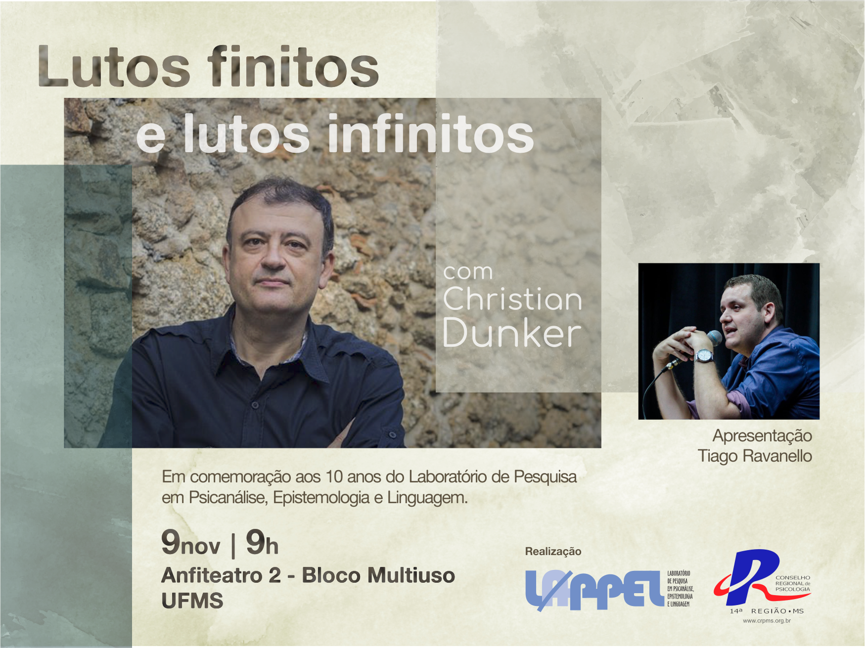 Em comemoração aos dez anos do Laboratório de Pesquisa em Psicanálise, Epistemologia e Linguagem (Lappel/UFMS), o grupo de pesquisa realiza no dia 9 de novembro, às 9h, no Anfiteatro do Complexo Multiuso, um evento aberto ao público com a presença do psicanalista e professor da USP, Christian Dunker, que ministrará a palestra “Lutos Finitos, Lutos Infinitos”.