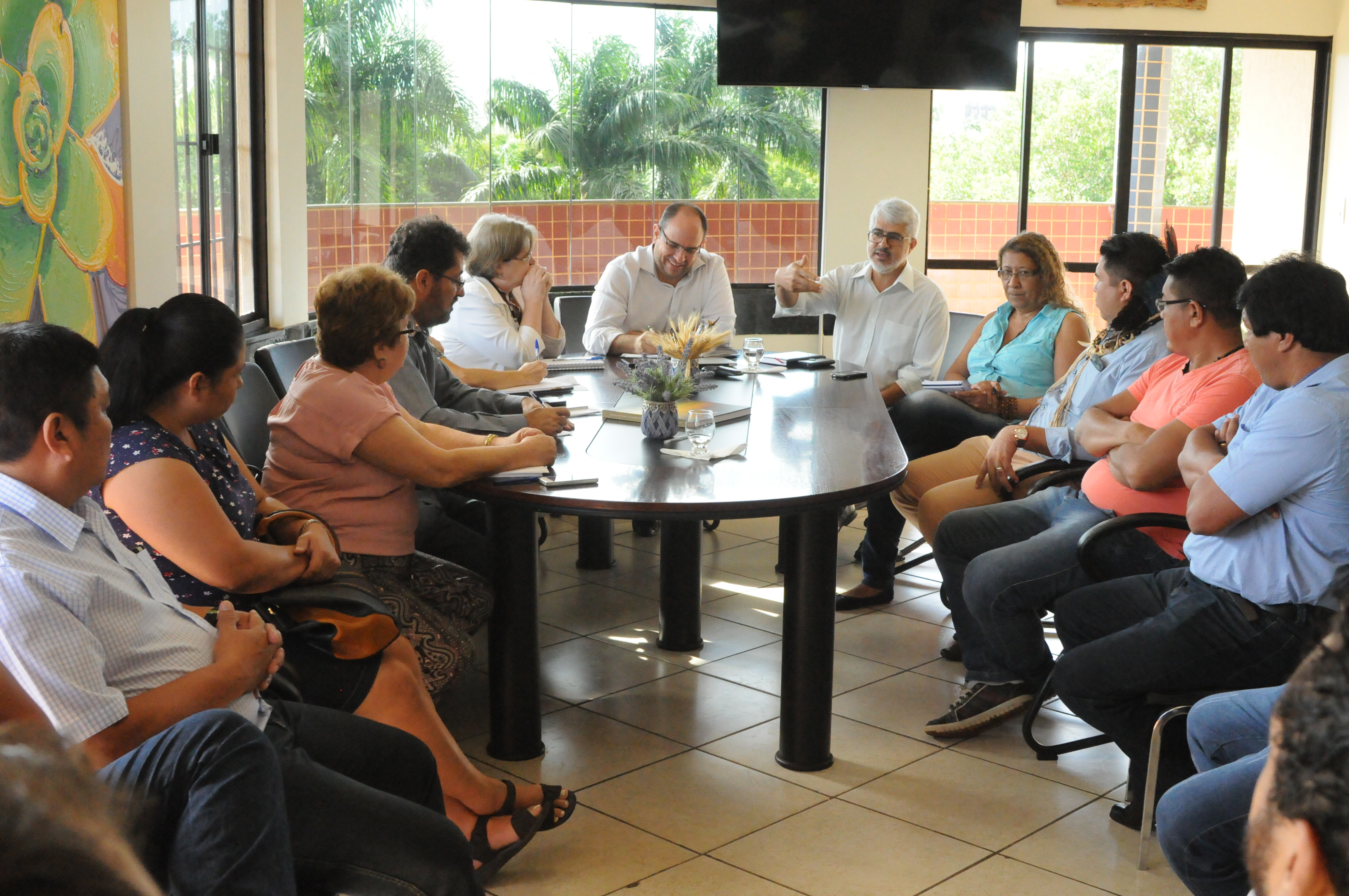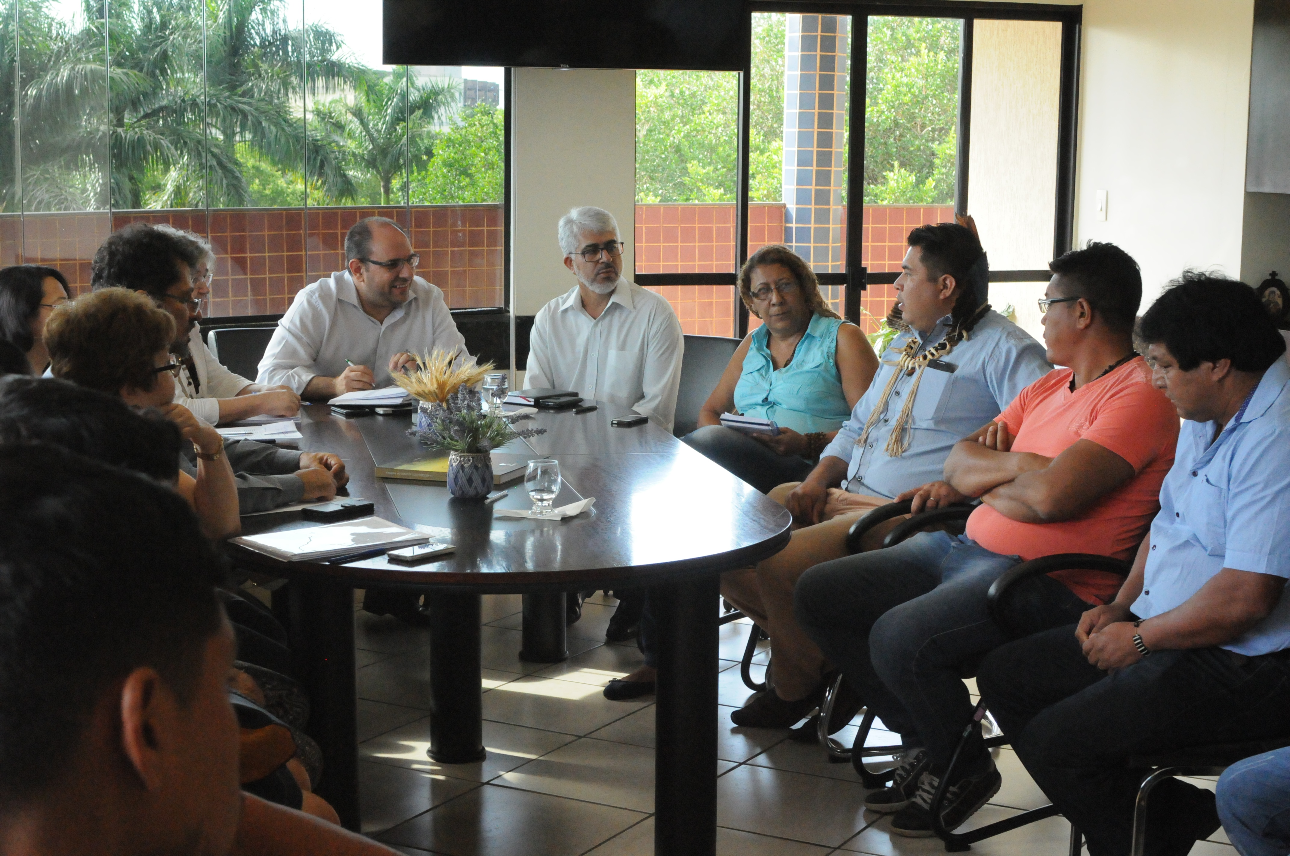 Representantes do Câmpus de Aquidauana (CPAQ) e da Licenciatura Intercultural Indígena Povos do Pantanal estiveram hoje (3) com o Reitor Marcelo Turine para conversar sobre demandas do curso. Participaram da reunião o Diretor do CPAQ Auri Claudionei Matos Frübel, os Pró-Reitores de Graduação, Ruy Alberto Caetano Corrêa Filho; e de Planejamento e Orçamento, Dulce Maria Tristão; e representando o Pró-Reitor de Administração e Infraestrutura Augusto Cesar Portella Malheiros, a servidora Rosemary Oshiro; além de professores da Licenciatura, professores e representantes indígenas de Aquidauana e servidores da UFMS do setor de convênios.