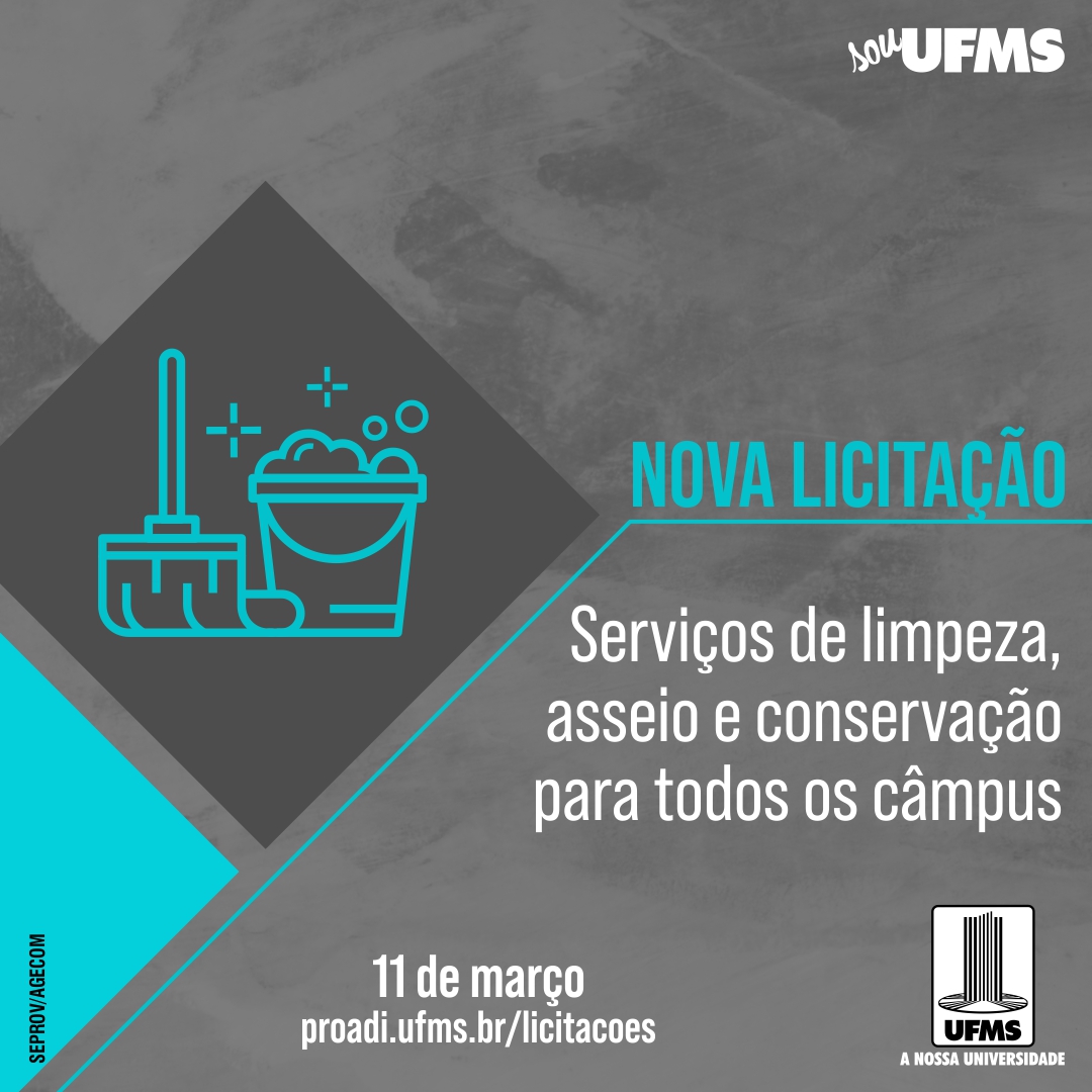 Será aberto amanhã, 11 de março, o pregão eletrônico que visa à contratação de empresa especializada na prestação de serviços de gestão e execução de limpeza, asseio e conservação predial para atender a UFMS. A atuação será na Cidade Universitária em Campo Grande, na Fazenda Escola, localizada em Terenos, e nos câmpus de Aquidauana, Chapadão do Sul, Coxim, Naviraí, Nova Andradina, Paranaíba, Ponta Porã, Três Lagoas e do Pantanal, em Corumbá.