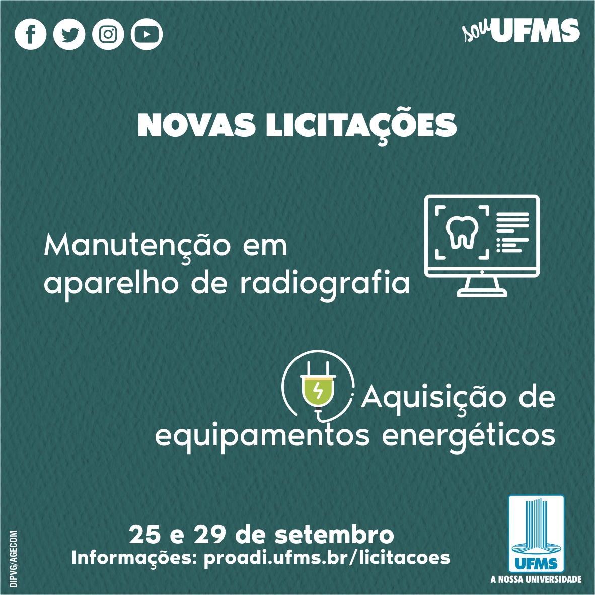 Duas novas licitações serão realizadas pela UFMS para atender demandas das unidades.  “Por meio dessas licitações, vamos atender a uma demanda da Faculdade de Odontologia que necessita de manutenção em aparelho instalado na unidade, mas também de vários outros setores com o pregão para registro de preços visando aquisição equipamentos energéticos”, diz o pró-reitor de Administração e Infraestrutura (Proadi) Augusto Malheiros.