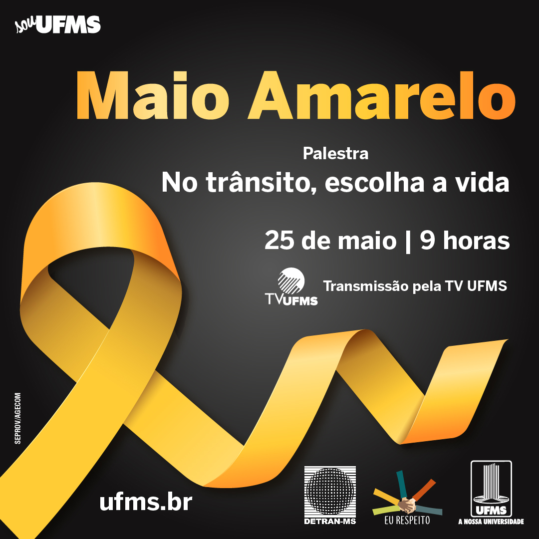 Como parte da Campanha Eu Respeito do mês de maio, será realizada na próxima quinta-feira, 25, às 9h, a palestra No trânsito, escolha a vida, com transmissão ao vivo pelo canal da TV UFMS. A ação faz parte das atividades de conscientização do Maio Amarelo e será ministrada pela diretora de Educação no Trânsito do Departamento Estadual de Trânsito (Detran-MS), Andrea Moringo.
