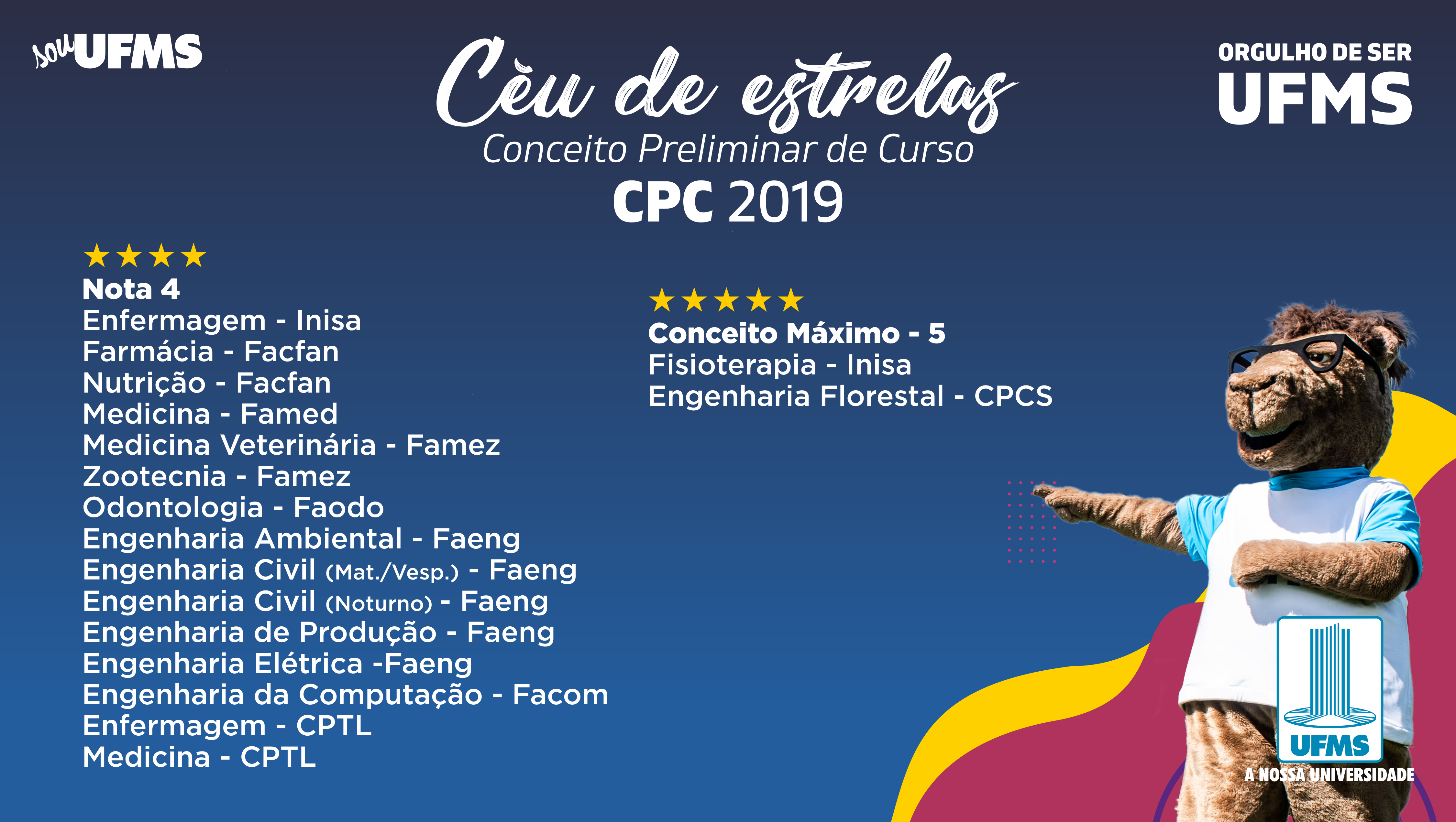 O Ministério da Educação e o Instituto Nacional de Estudos e Pesquisas Educacionais Anísio Teixeira (Inep) divulgaram os resultados do Conceito Preliminar de Curso (CPC) 2019 no início deste mês. Dos 21 cursos da UFMS com CPC 2019 calculado, dois obtiveram conceito 5, 15 obtiveram conceito 4 e quatro cursos obtiveram conceito 3.