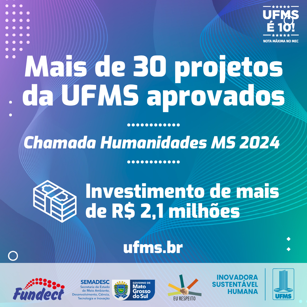Dos 50 projetos de pesquisa aprovados na chamada Humanidades MS da Fundação de Apoio ao Desenvolvimento do Ensino, Ciência e Tecnologia do Estado de Mato Grosso do Sul (Fundect-MS) e da Secretaria de Estado de Meio Ambiente, Desenvolvimento, Ciência, Tecnologia e Inovação (Semadesc), 33 são coordenadas por pesquisadores da UFMS, o que representa 66% das aprovações. As propostas devem receber investimentos de mais de R$ 2,1 milhões. O resultado final foi divulgado nesta terça-feira, 13, e pode ser acessado nesta página.