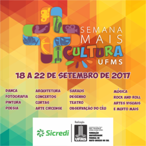 De 18 a 22 de setembro, a UFMS será palco de diversas apresentações de arte e cultura, com uma programação intensa de apresentações musicais e de dança, discussões acadêmicas sobre arte, mostra de curtas metragens e fotografias, entre outros eventos abertos ao público e gratuitos.