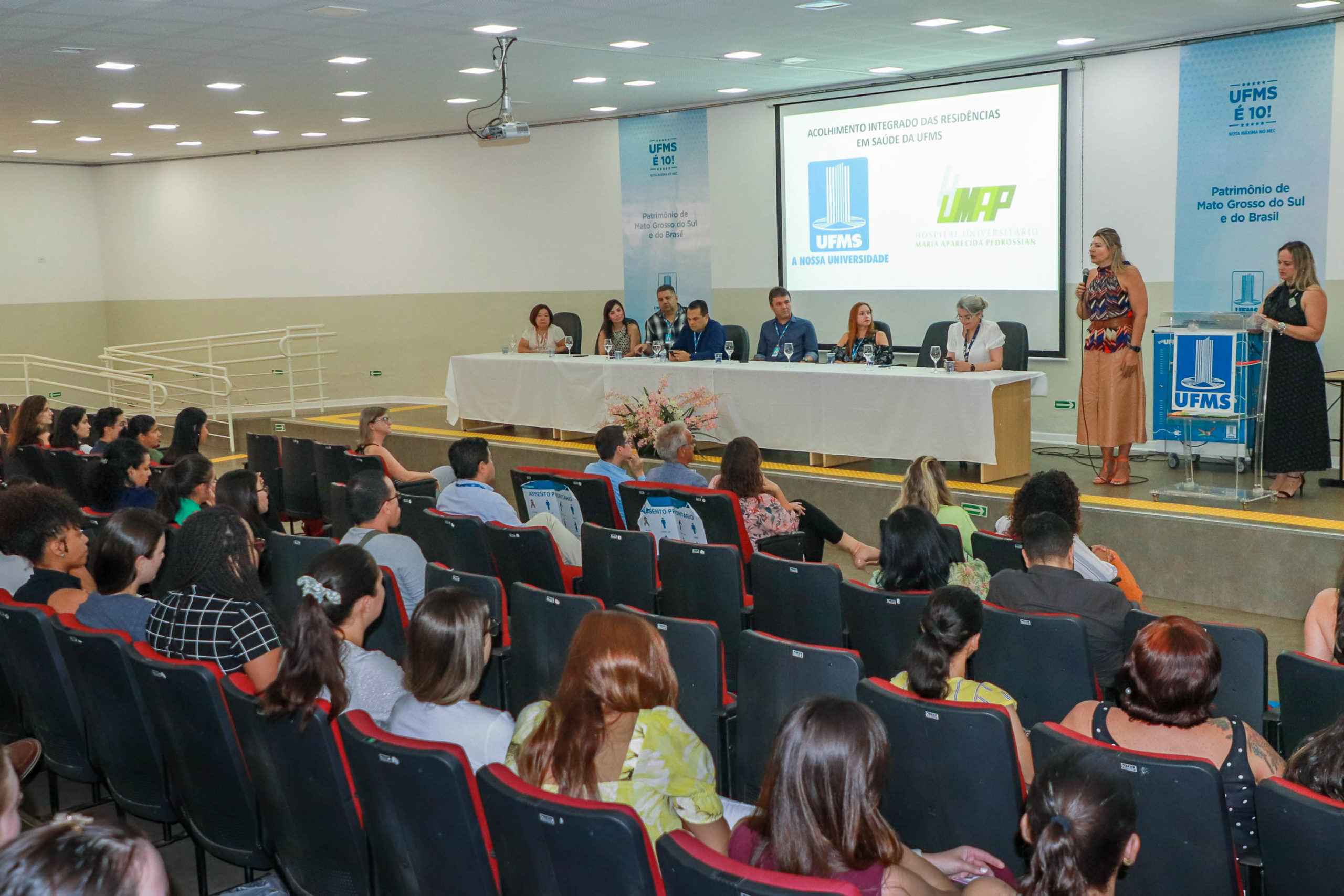 Participaram da cerimônia, o diretor da Faculdade de Medicina (Famed), Marcelo Vilela, representando o reitor Marcelo Turine; o diretor de Pós-graduação, Daniel Lopes, representando a pró-reitora de Pesquisa e Pós-graduação Maria Lígia Macedo; o diretor do Instituto Integrado em Saúde, Marcos Ferreira, representando os diretores das unidades setoriais onde são ofertadas as especializações; a coordenadora da Comissão de Residência Multiprofissional em Saúde, Camila Polisel; a integrante da Comissão de Residência Médica do Humap-UFMS Ebserh, Débora Doreto, representando o coordenador Bruno Filardi; a superintendente do Humap-UFMS/Ebserh, Andrea Lindenberg; a representante da Secretaria Estadual de Saúde e da Escola de Saúde Pública de MS, Maria de Lourdes Oshiro; e a secretária municipal de Saúde, Rosana Melo.