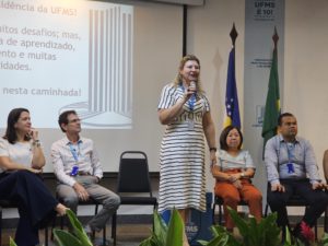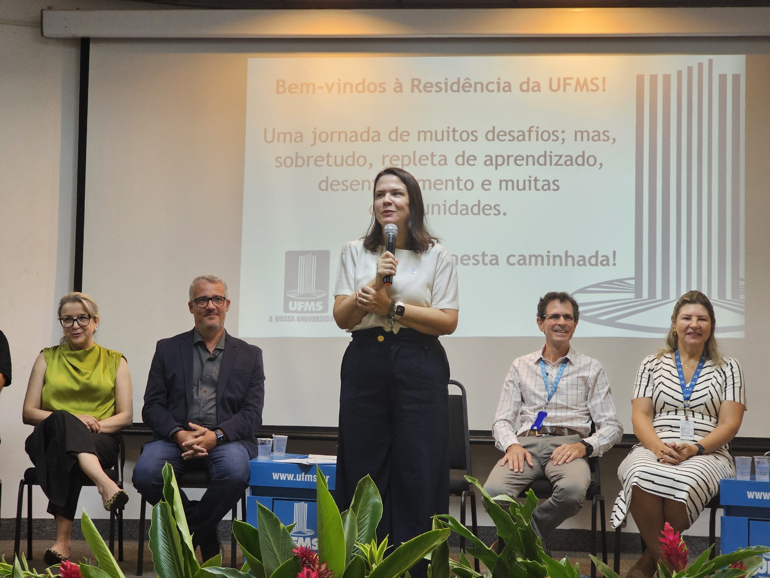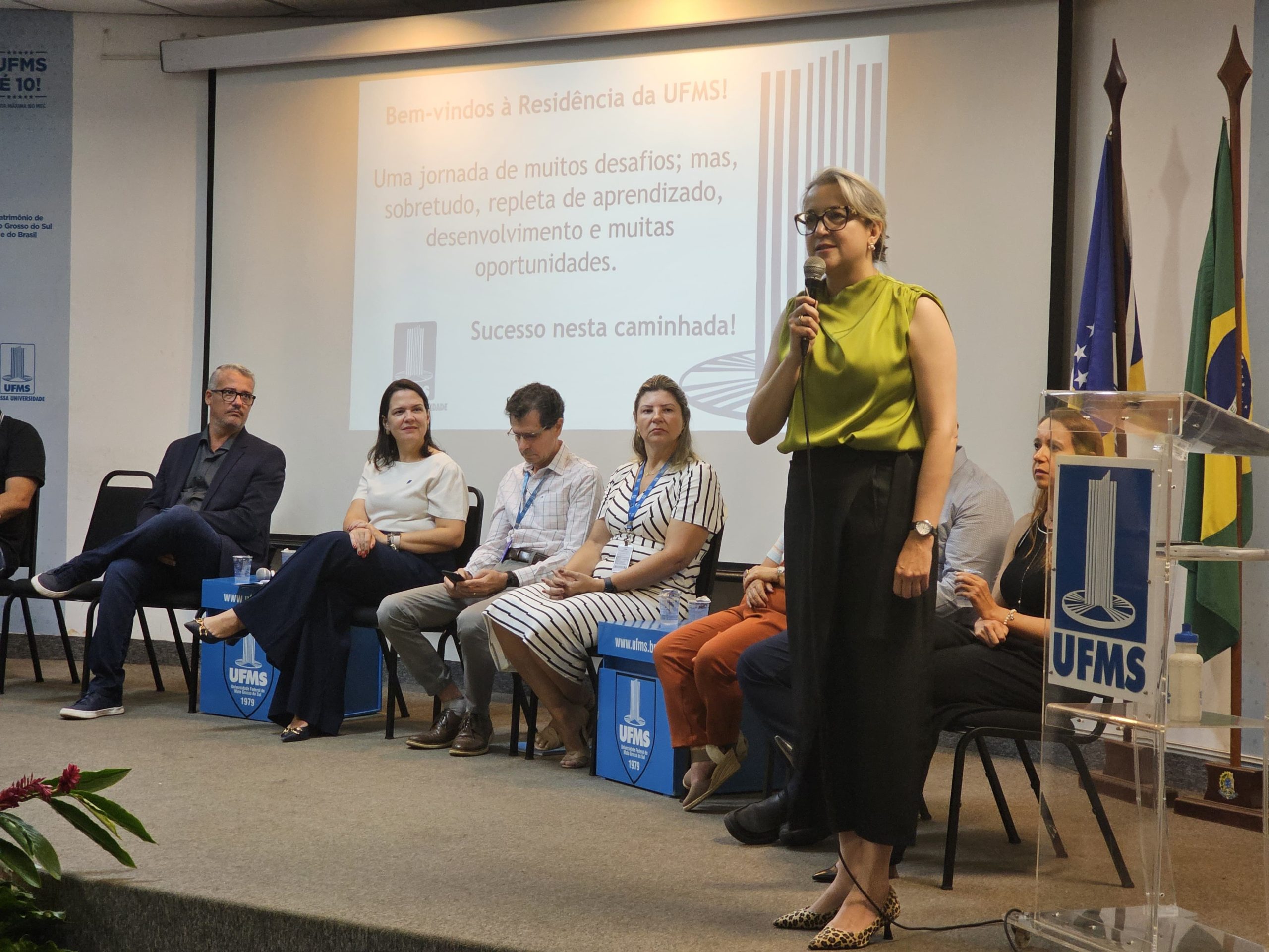 “Sejam muito bem-vindos à nossa Universidade! Esse momento foi preparado com muito carinho. É muito importante reunir todos os novos residentes para esse acolhimento e também orientação em relação a tudo que a Instituição oferece para melhorar ainda mais a formação profissional de vocês. Sintam-se todos abraçados pela UFMS”, disse a reitora.