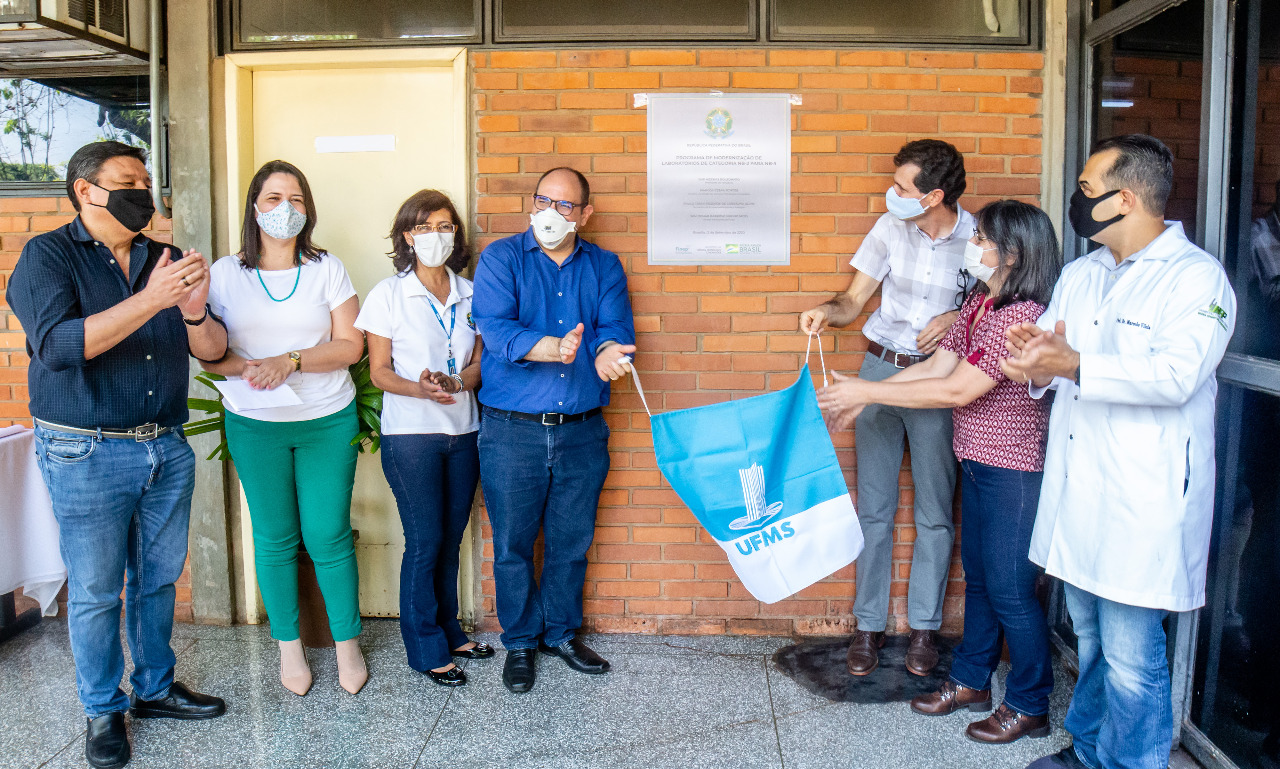 Para comemorar a inserção da UFMS no programa de modernização dos laboratórios do MCTI, foi descerrada placa no Biotério, localizado na Cidade Universitária, nesta quinta-feira, 10. “Neste momento de pandemia da Covid-19, as instituições de ciência e tecnologia estão sendo demandadas para trazer soluções a fim de garantir saúde e bem estar da população. A UFMS tem sido referência em relação a isso, pois temos cientistas de talento. Mas, para tornar nossas pesquisas mais eficazes e eficientes, precisamos de investimentos na infraestrutura. Hoje, estamos felizes pelo resultado do edital nacional que direciona recursos ao Biotério pelo MCTI e pela Finep. A unidade precisava de investimentos para adequação do sistema de biossegurança, a fim de tornar possível a realização de trabalhos envolvendo o novo coronavírus. Parabenizo toda a equipe e unidades pelo esforço. Estamos no caminho certo para garantir a qualificação de novos cientistas e gerar conhecimento para o país e para o mundo”, comenta o reitor Marcelo Turine.