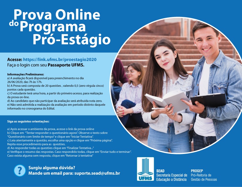 A avaliação será nesta sexta-feira, dia 26 de junho, e o acesso será pelo site link.ufms.br/proestagio2020. Apesar de ter duração de uma hora, os estudantes podem escolher o horário que melhor se adeque a sua rotina, desde que seja na faixa das 7h às 17h.