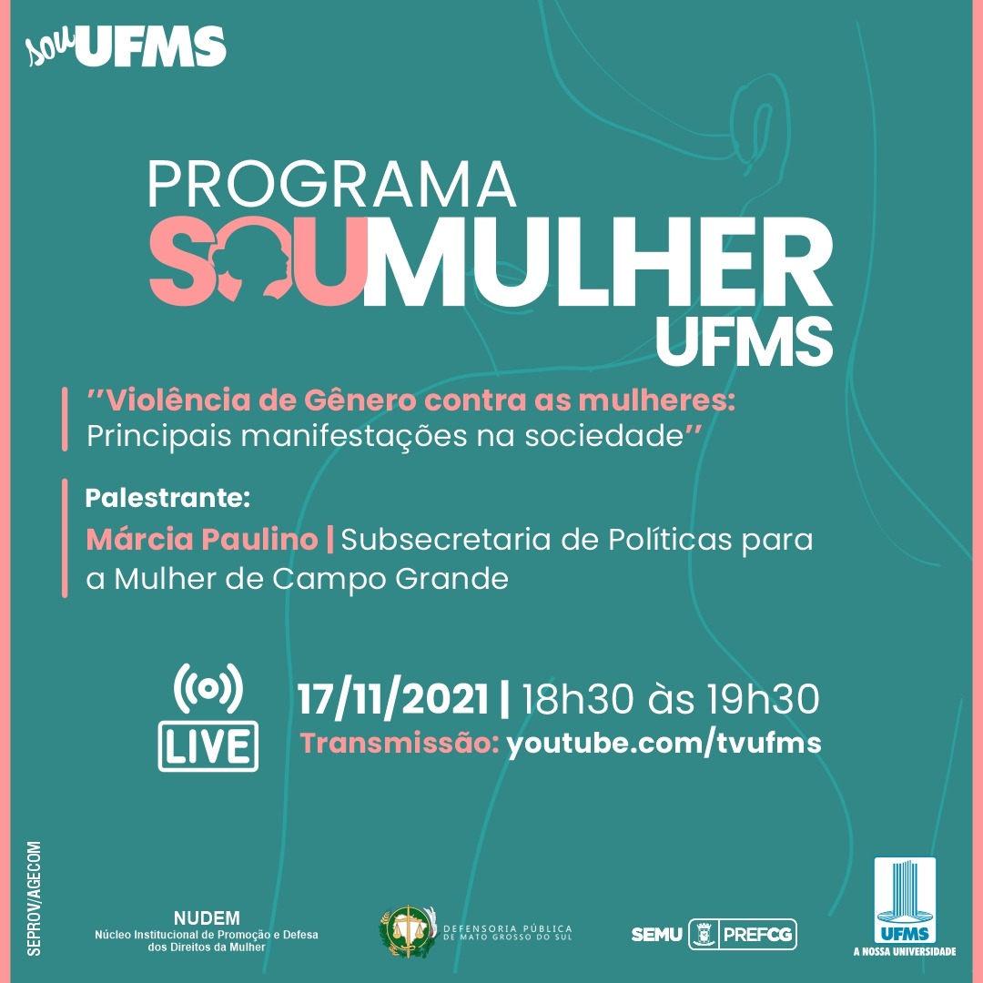 Hoje, às 19h30, será realizada a live “Violência de Gênero contra as mulheres: principais manifestações na sociedade”, com transmissão pela TV UFMS.