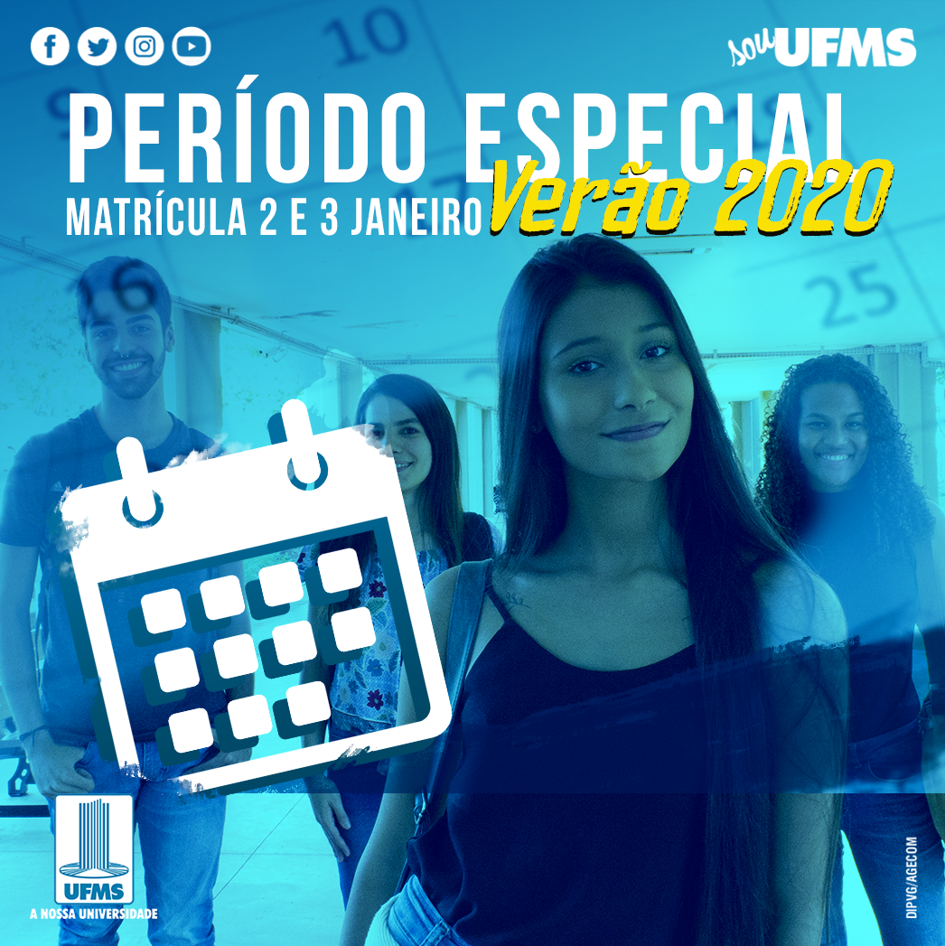 Nos dias 2 e 3 de janeiro, os estudantes poderão realizar a matrícula on-line para o período especial de Verão, pelo endereço: siscad.ufms.br. O Período Letivo de Verão da Graduação – 2019/2 começa no dia 6 de janeiro e segue até o dia 30 de janeiro de 2020. São 167 disciplinas distribuídas em 22 Unidades da UFMS.