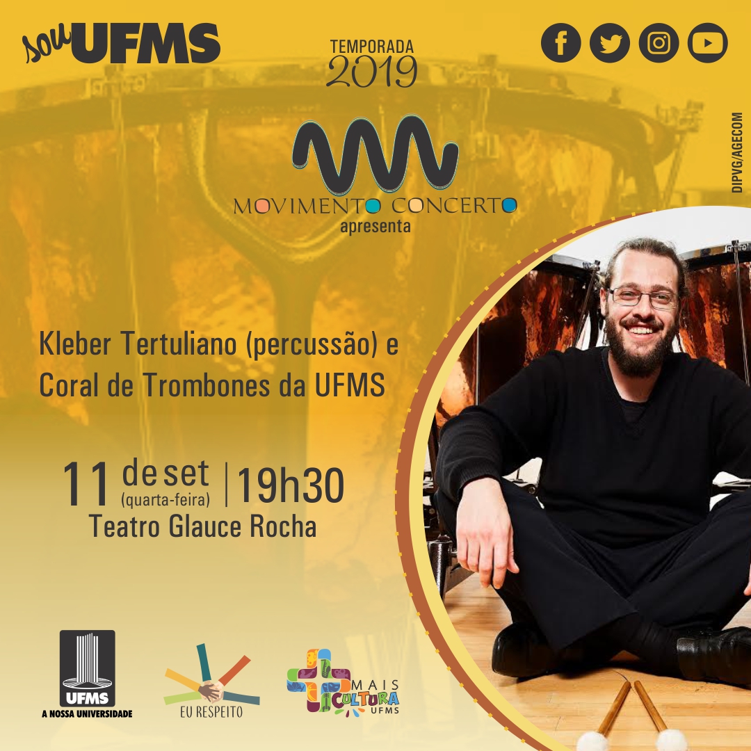 Na quarta-feira (11), o Coral de Trombones da UFMS recebe o percussionista brasileiro, residente na Alemanha, Kleber Tertuliano, músico que iniciou seus estudos em Rio Claro, sob a orientação da professora Renata Giaretta, e depois estudou com o professor John Grant (EUA).