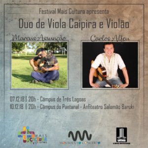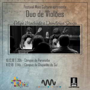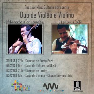 Em parceria, o programa Mais Cultura e o Movimento Concerto encerram o ciclo de apresentações nos câmpus que foi iniciado em outubro com o Duo Amálgama em Naviraí e Nova Andradina. Na próxima sexta, dia 30, às 20h, os músicos Marcelo Fernandes e Heitor Lotti formam o Duo de Violão e Violino e iniciam a série de concertos no campus de Ponta Porã. A dupla se apresenta ainda em Coxim e na Cidade Universitária.