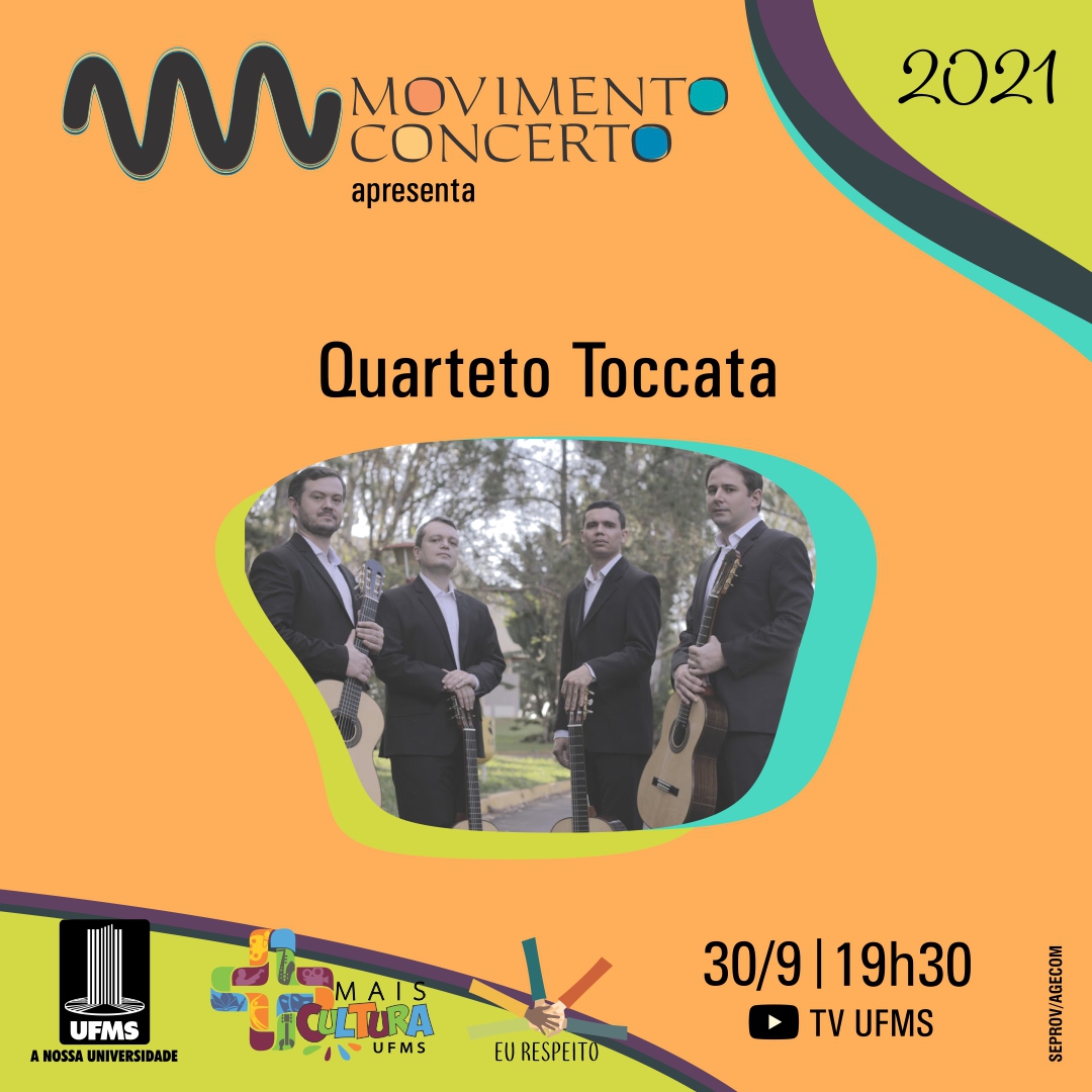 O Movimento Concerto encerra o mês de setembro com apresentação do Quarteto Toccata, formado por violonistas. A transmissão será na quinta-feira, 30, às 19h30 pelo canal da TV UFMS. A programação integra as atividades da campanha Eu Respeito do mês de setembro, que visa a valorização da vida.