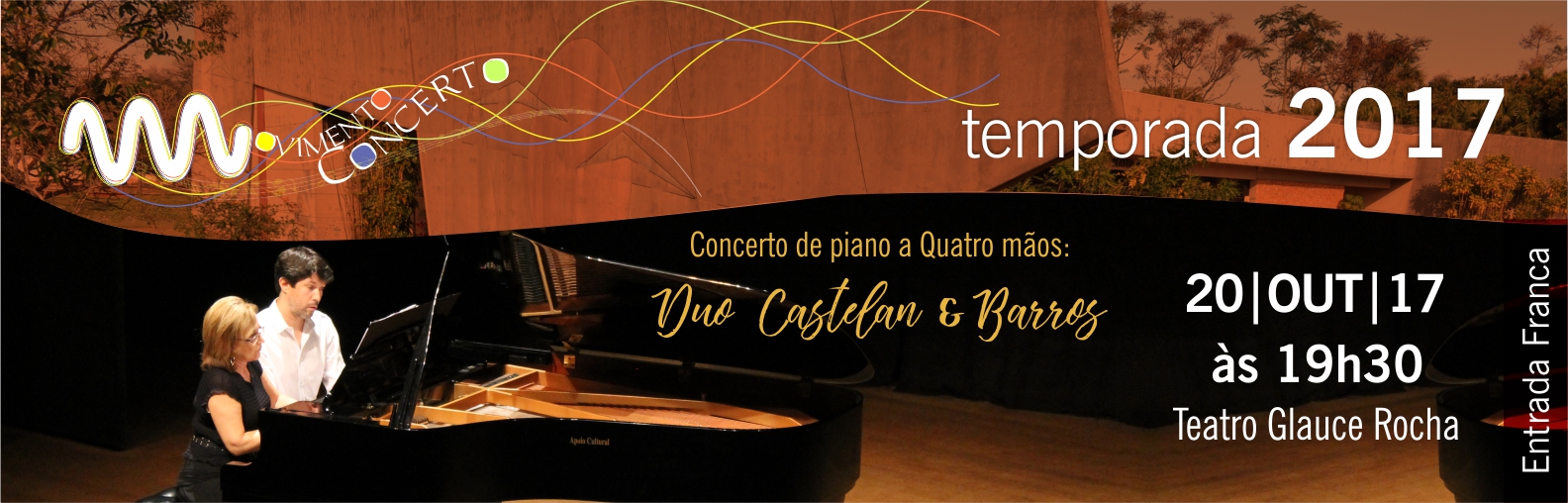 No dia 20 de outubro, a partir das 19h30, o Teatro Glauce Rocha irá receber o Duo Castelan & Barros – Piano a Quatro Mãos. A apresentação faz parte do projeto Movimento Concerto da UFMS e contará com a pianista Bernardete Castelan Póvoas, Doutora em Música pela UFRGS, com residência na Universidade de Iowa (EUA), e com o pianista Luís Cláudio Barros, Doutor em Música pela UFRGS, com residência na Universidade de Connecticut (EUA).