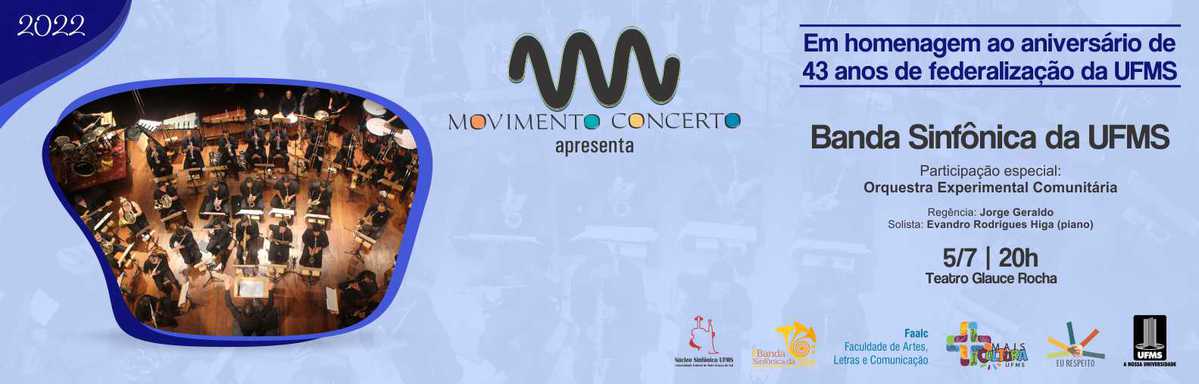 Como parte da campanha Eu Respeito, a edição de julho, o Movimento Concerto traz para o Teatro Glauce Rocha apresentações da Banda Sinfônica com participação da Orquestra Comunitária da UFMS durante a abertura. O evento será realizado na próxima terça-feira, 5, às 20 horas, em homenagem aos 43 anos de federalização da UFMS.